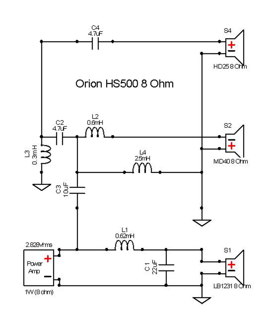 Mivel sehol nem találtam, felvázoltam egy 4 Ohm-os HS700 hangváltóját, a HS500 is kb. ugyanez plusz egy tekerccsel.