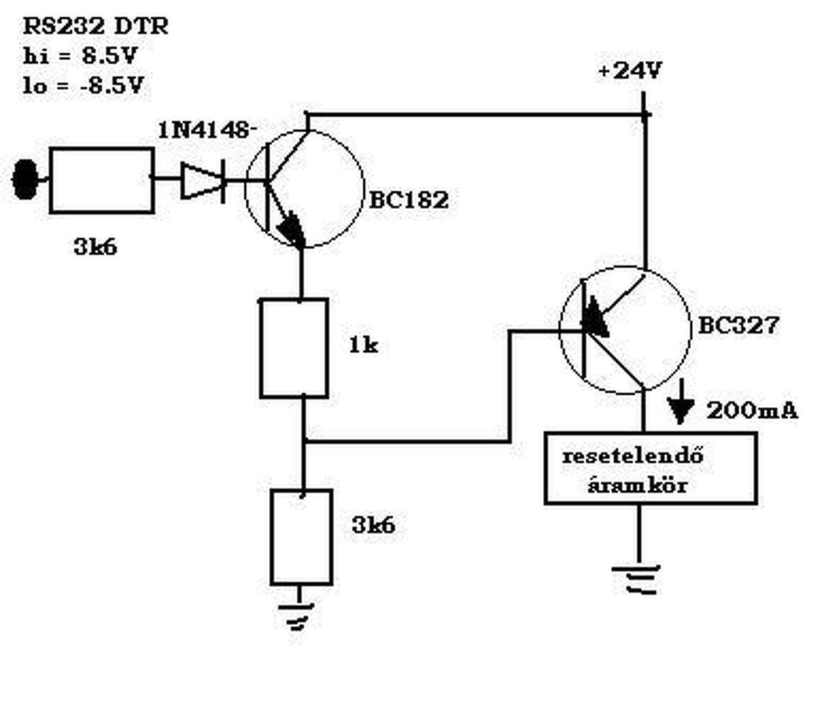 Szeretnék egy olyan kapcsolást készíteni, ami egy 24VDC-s egyébként nem nagy fogyasztó áramkört (max 200mA) tudná resetelni - azaz megszakítani a tápfeszültségét egy időre- a soros port DTR jelével. (magas +8.5V, alacsony -8.5V , és max 5mA) PNP tranzisztorok bázis ellenállás méretezésével -kapcsoló üzemben- semmi gyakorlatom nincs, ezért kérnék segítséget, ha valaki járatos szakértő rá tudna nézni hogy jó-e a kapcsolás így, azt nagyon megköszönném! A hozzászólás módosítva: Szept 28, 2016
