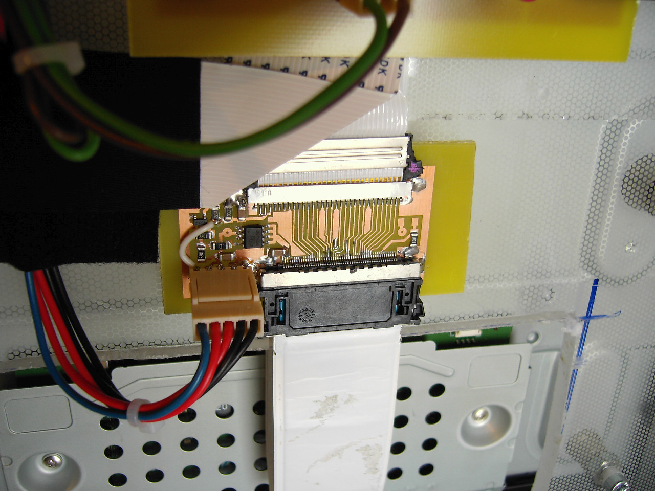Köszi az infót közben az egyik ismerősöm régebbi TV-je betört így gondoltam megpróbálom a 26-os LCD TV-be valahogy belerakni. Megnéztem a két kijelző adatlapján a csatlakozó kiosztást és mind a kettőnek ugyan azok (legalább is szerintem) a csatlakozó megnevezései csak a kiosztásuk és a méretük más. Első körben a 26-os kábelét nem akartam nagyon átalakítani így a csatlakozót lehúztam a Main panelről és abba óvatosan beledugdostam a donor Main-ről jövő kábeleket (figyelve a csatlakozók kiosztását). Az eredeti kijelző V270W1-L04 és aminek a Main-ja menne rá az pedig T315W02. Valamelyest működik de első körben csíkozódott a kijelző majd a a kábel mozgatására csak kékes volt az egész (első kép) majd amikor jelet raktam a donor Main-ra és megpróbáltam csatornát váltani kicsit másabb lett a kép (második kép).