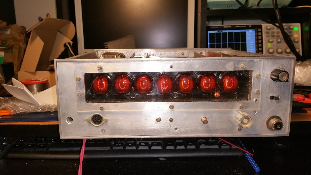 Ismét egy Műszermentésről számolhatok be. Aukciós oldalon potom pénzért vettem egy "valami kijelzős műszer, hibás, alkatrésznek" című valamit. Már a fényképek alapján titkon reméltem, hogy ez az amire gondolok, de amikor megérkezett, bebizonyosodott. Ez egy a 80-as években készült amatőr által (a szó legnemesebb értelmében) készített digitális TTL IC-kel felépített Nixie-s freki mérő, etalon frekvencia kimenetekkel. Egy Házilag készített fűtött, termosztált precíziós 1MHz-es időalap dolgozik benne, hungarocell belő szigeteléssel. Hibásan érkezett, egy vezeték le volt szakadva, illetve az egyik számláló áramkör hibás volt. Pár óra alatt megjavítottam. Beállítani sem kellett, digit szkóppal nézve tökéletesen pontos. Külön érdekesség, hogy még a dobozt is kézzel készítették. Hasznos kis műszer lesz a múltkor felélesztett EMG Generátor mellett.