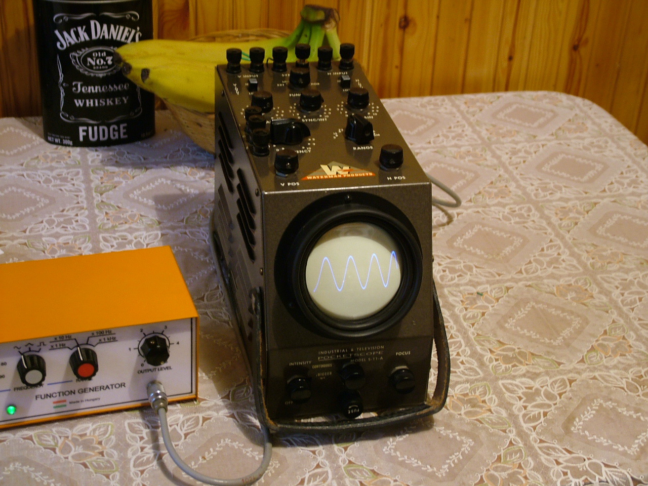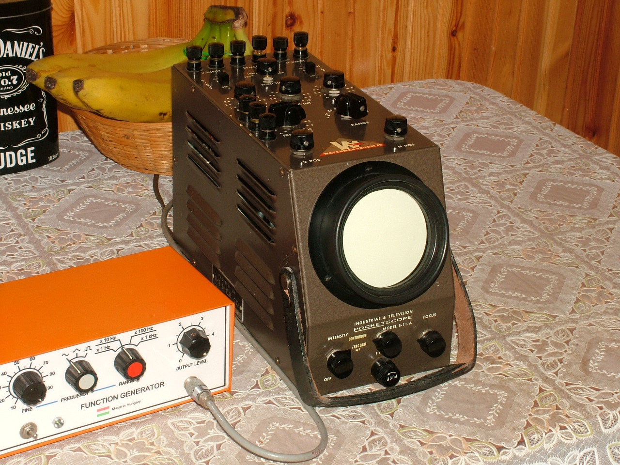 Egyik barátomtól kaptam ajándékba (Németországban vette nekem egy börzén) ezt a kis pocket szkópot. Az USA-ban gyártották 1948-ban! Az ottani szokásoknak megfelelően 110V-ról üzemel, és a katódsugárcsövet is beleszámítva mindössze 7db elektroncső van benne. Csak annyi hibája volt, hogy a táprészében, és a fűrészgenerátorában majdnem az összes kondit ki kellett cserélni. Akit jobban érdekel, a műszaki adatait, és a kapcsolási rajzát egy PDF dokumentumban erről a link-ről letöltheti. Található ezen az oldalon még sok szép kép (a belső felépítéséről is).