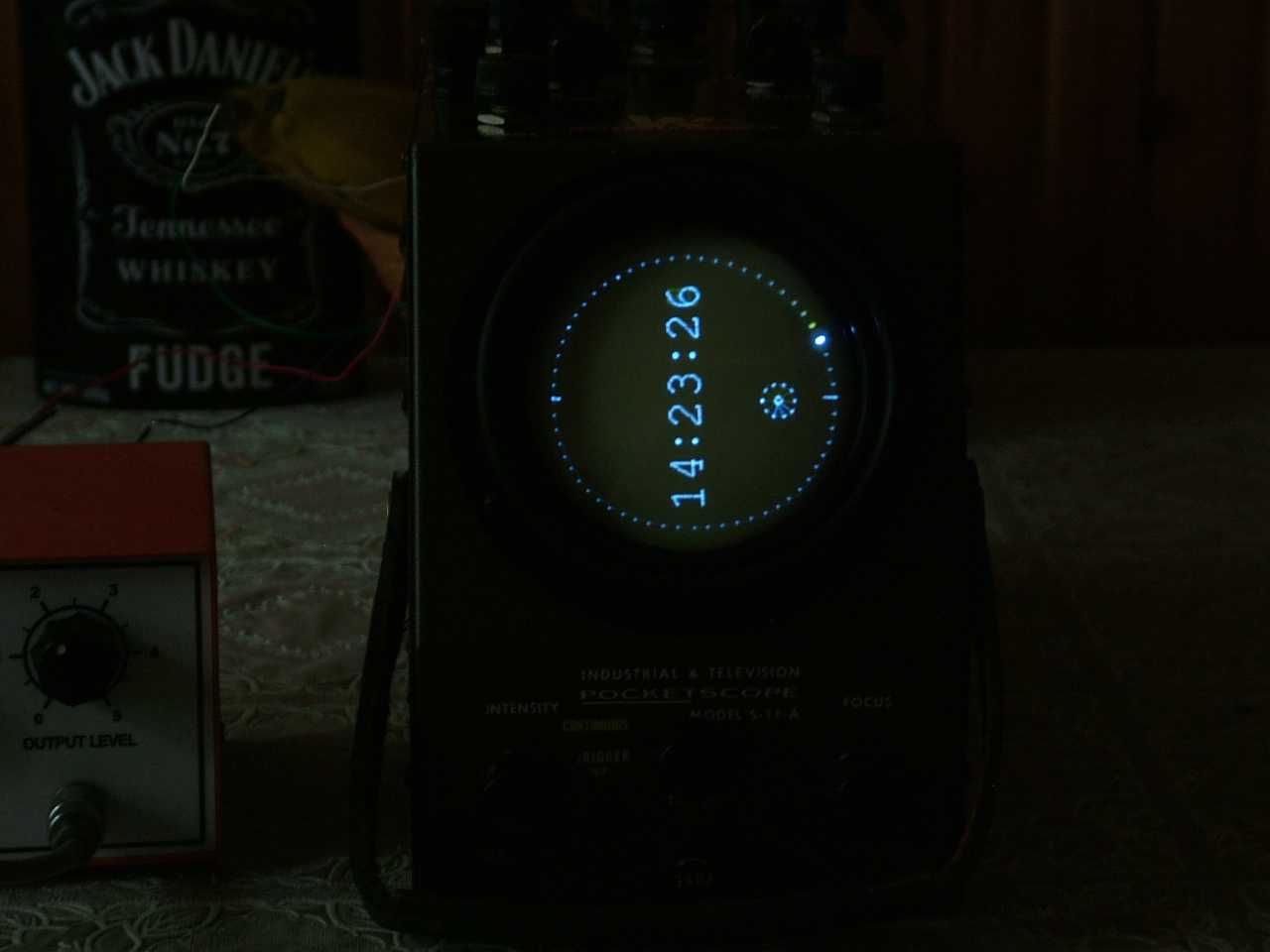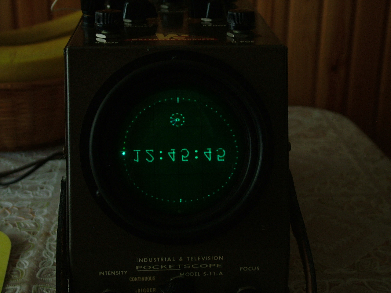 Ezt a szkóp-órát csak az érdekesség kedvéért kapcsoltam rá a szkópra. Már építettem hozzá deszka modellben több k.s. csővel monitort, ahol ez nem problémás, mert akkor a katódsugárcsövet úgy fordítom, ahogy szükséges, vagy az eltérítő lemezeket úgy csereberélem, hogy jó legyen a kép.