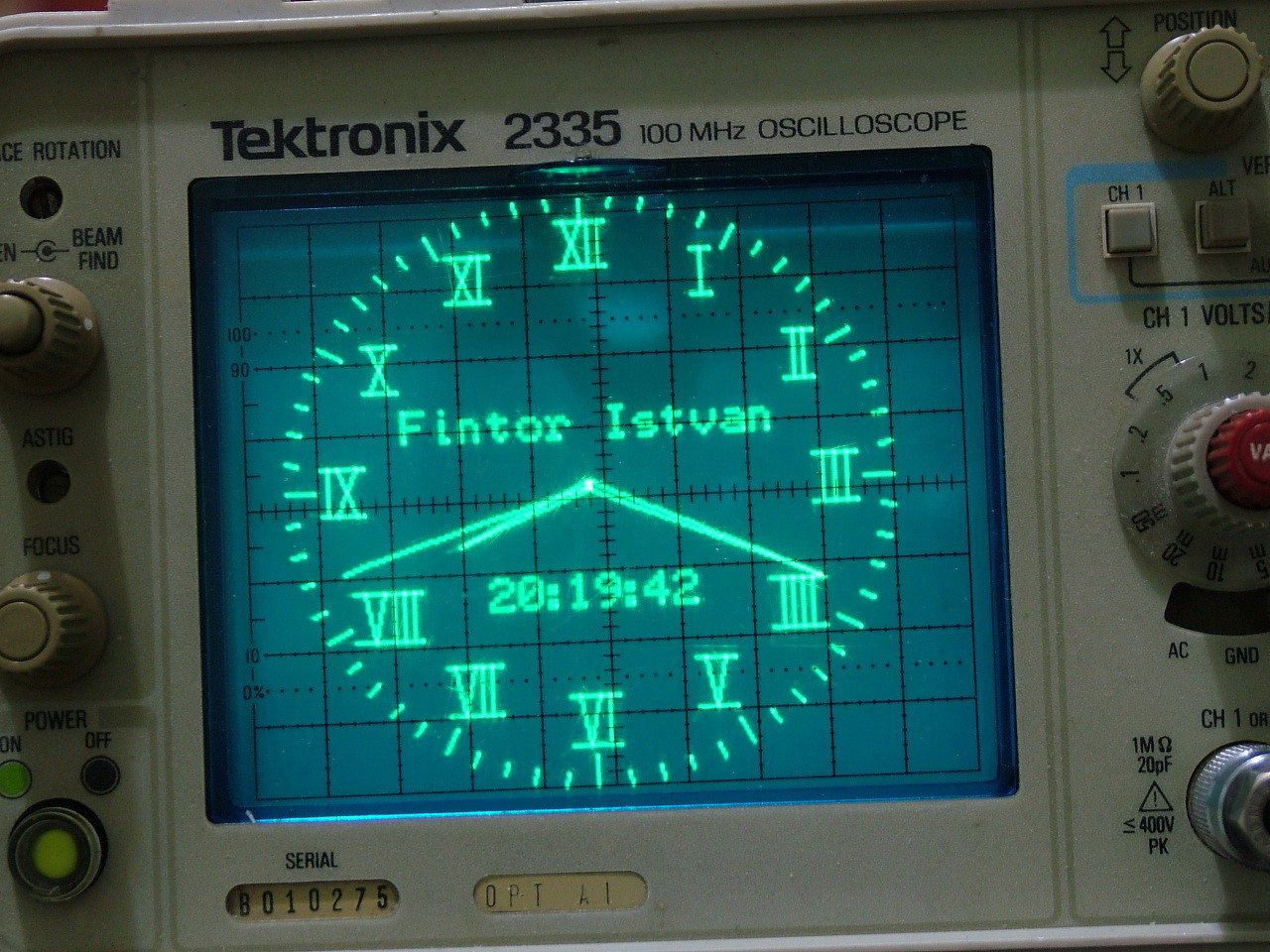Sajnos ezen csak úgy lehetne segíteni, hogy a képcsövet kellene elforgatni a szkópban 90 fok-al jobbra, vagy a szkópot kellene a jobb oldalára fektetni, és még az is megoldás lehetne, hogy magát a fényképet fordítani el 90 fok-al, de még a program átírásával is lehetne helyesbíteni. A most küldött képen rajta van az eredeti zöld színű raszterbeosztásos műanyag lap is a képcső előtt. Csak azért szedtem le, hogy a raszter ne zavarja az óra képét. Érdekes, hogy nélküle a képcső kékes-fehéren világít a megszokott zöld helyett.