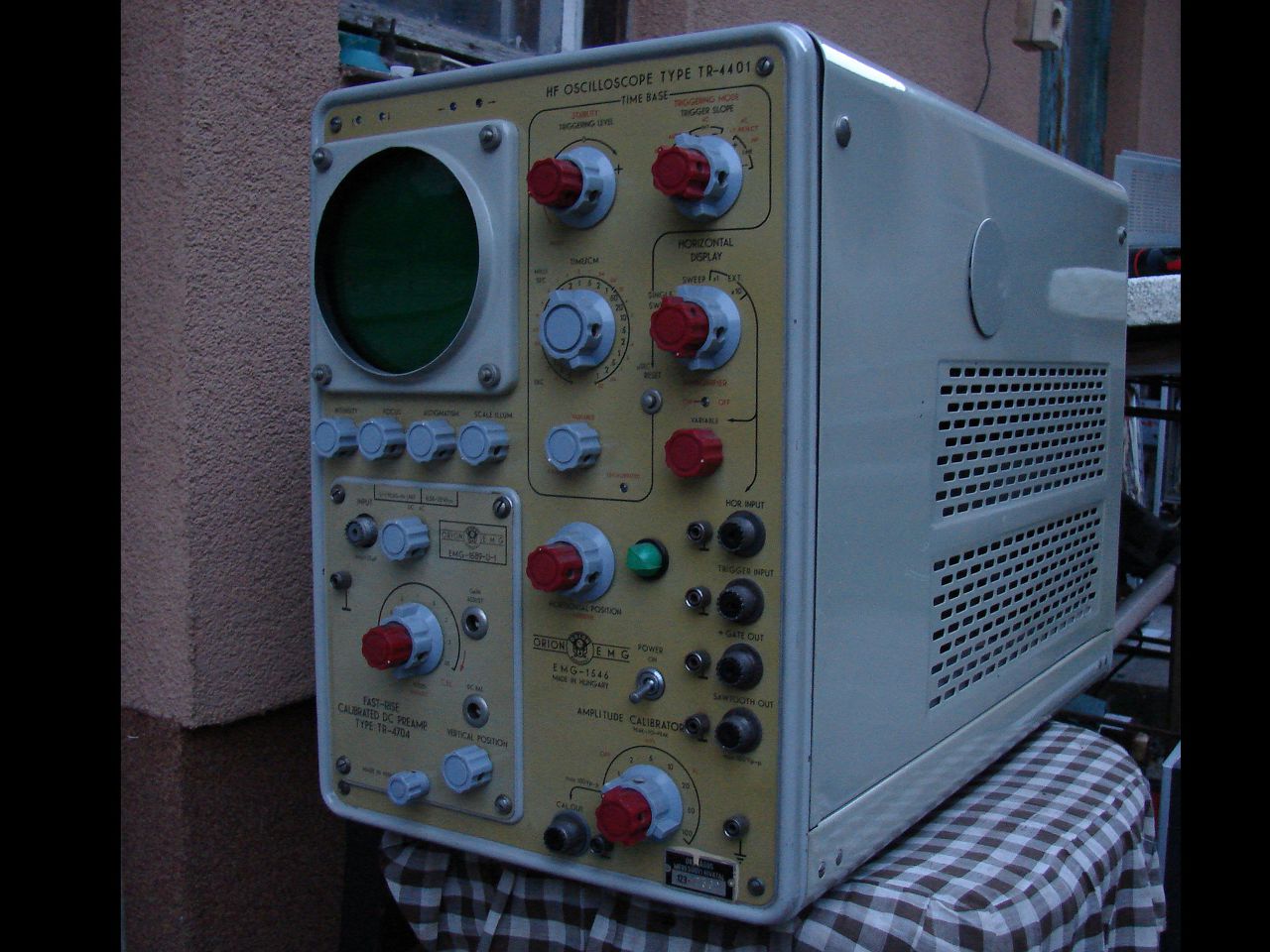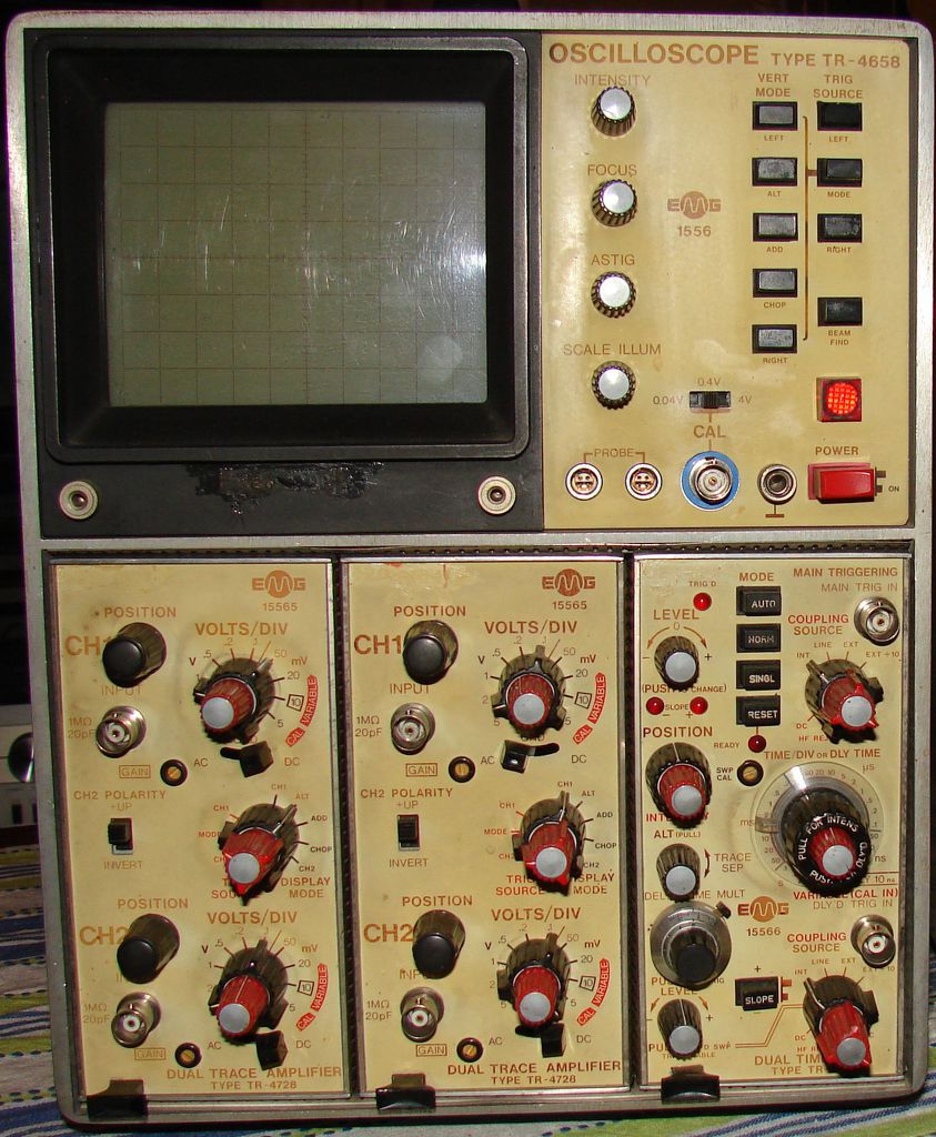 Nem elírás! Ezen a linken letölthetsz egy PDF dokumentumot is, abban megtalálod a kapcsolási rajzát is, és ha van türelmed megszámolhatod. És ez csak egy 30 MHz-es szkóp volt, 500W a fogyasztása. A hálózati trafó akkora benne, mint egy hegesztő trafó. Nekem van egy tökéletesen működő ilyen 1546-os szkópom is, és nem tudnám megmondani, hogy hányat javítottam, mert 1967-1972-ig az EMG szervizében dolgoztam. Volt egy kétsugaras változata is (EMG 1552) annak külön dobozban volt a tápja. Abban még több cső volt.