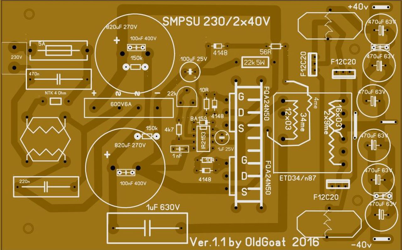 A 230V-os grätzet nem a két pufferkondi közé tenném, hanem alulra, és a két kondit összekötő sávgubanc eltűnik. Az ellenállások lábhosszát lehet növelni, így a két forrpont közti átvezetés nem szenved keskenyítést (pl. az 56 ohm). Ez a trükk egészen kézenfekvő... A baloldali F12C20-at 180 fokot elforgatva nem kell kacskaringózni a vezetősávval. A szekunder oldali pufferkondikat összekötő sávok meg még mindig csúnyák! Egyenes vonal nem megy? A segédtáp meg nincs stabilizálva! Mondom, egyszerűsítés, rövid vezetékek, az alkatrészek forgathatók. A hozzászólás módosítva: Szept 16, 2016