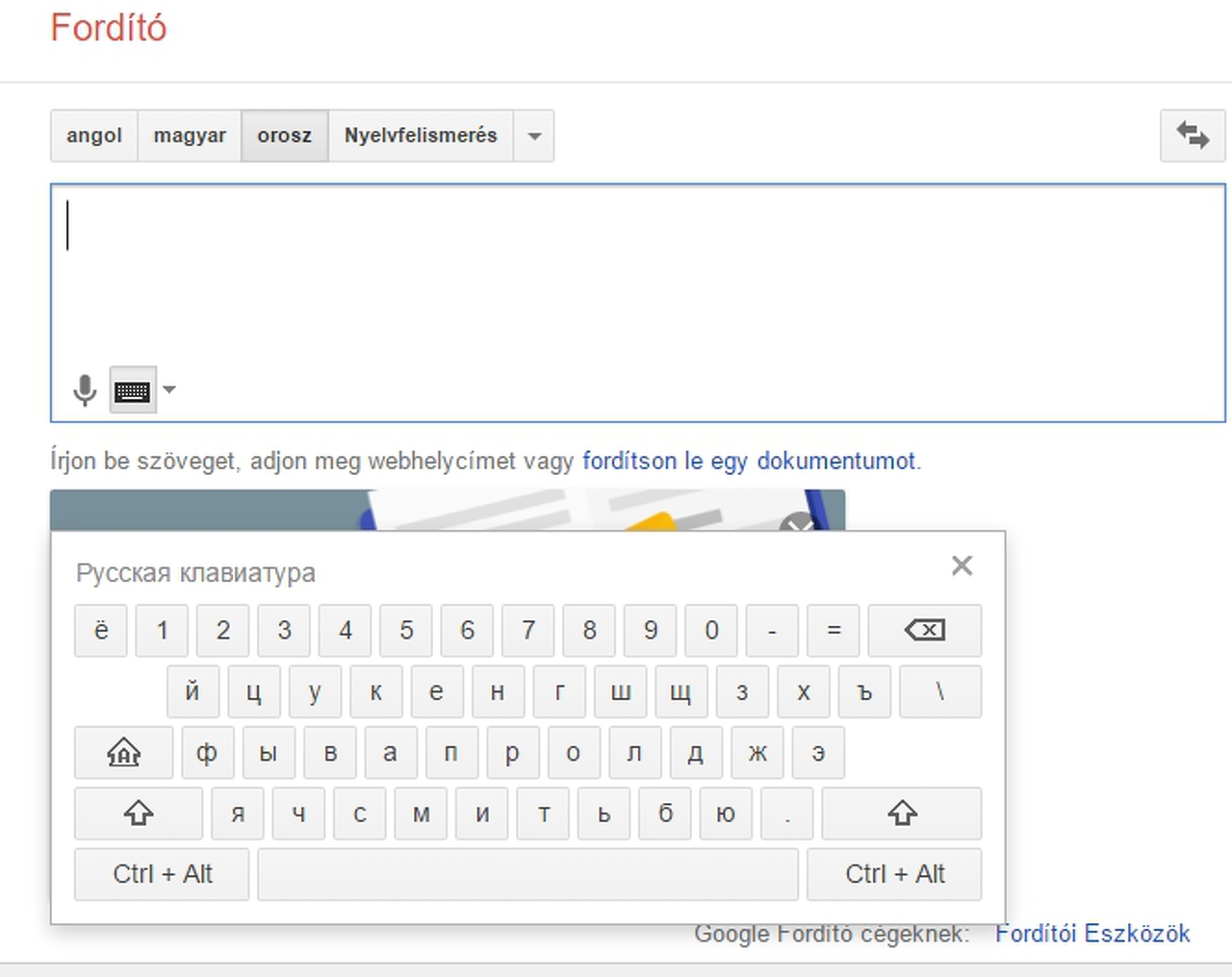 A cirill billentyűzetet le lehet tölteni, s a gépre fel. Nekem a bal alsóban, a bill.nyelveknél ott a váltás, a képernyő alján ott a szimbólum (virtuális klaviatúra). Csere, felhúzás, és írok cirillel; sok mindent meg lehet találni így. A Google egész jól fordítja (néha elkel, mert már elfelejtettem).