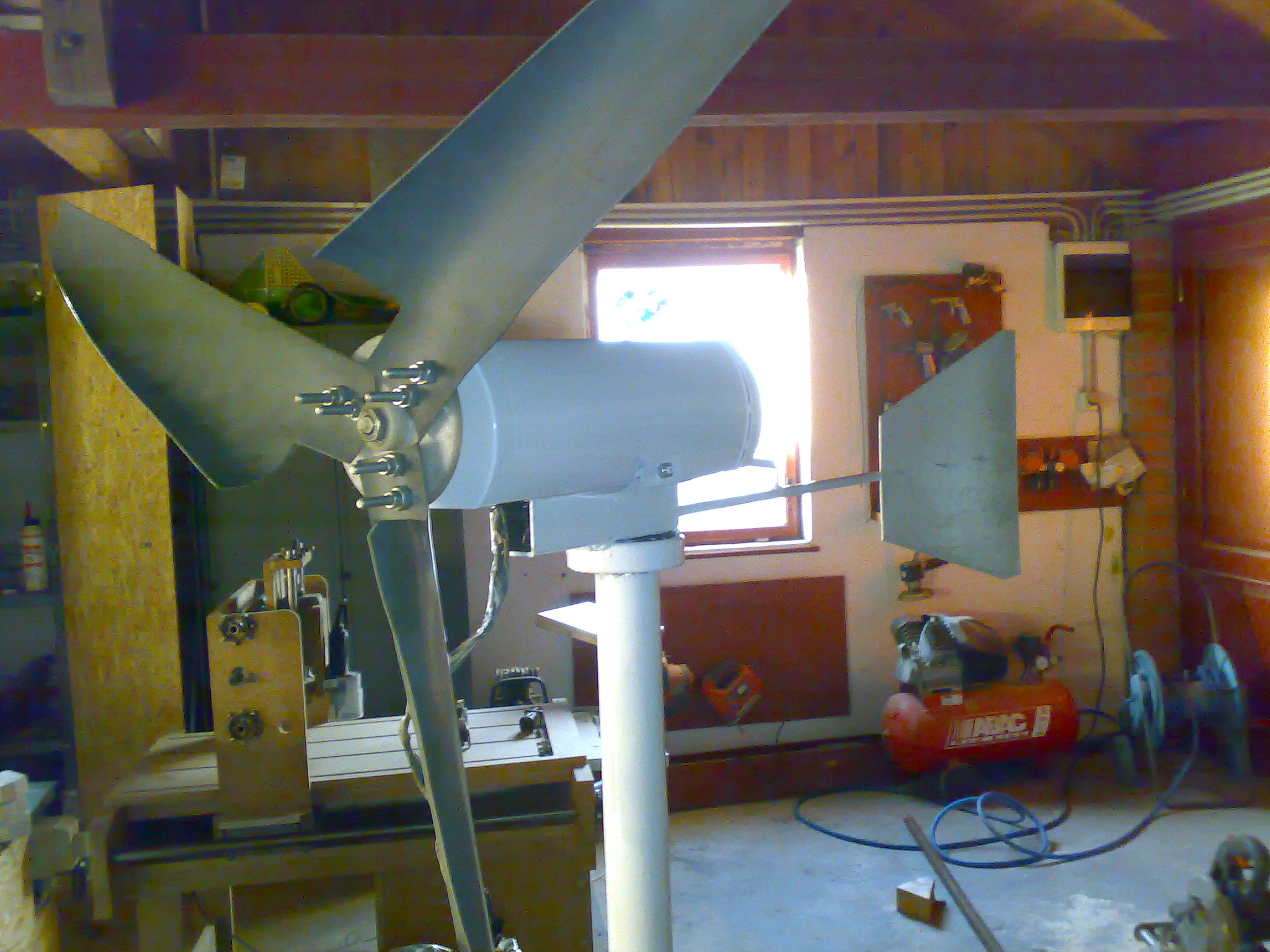 Jól néz ki a szélkereked, de van egy hibája. A lapát kialakítás ! Ha jól látom ez éppen a kilépő él irányába forog, ami nem a legjobb a hatásfok szempontjából. Ha nem így van, javítsatok ki ! Bár lehet, hogy a csőből kivágott lapát profilja nem olyan érzékeny a megfúvási irányra.... ?!