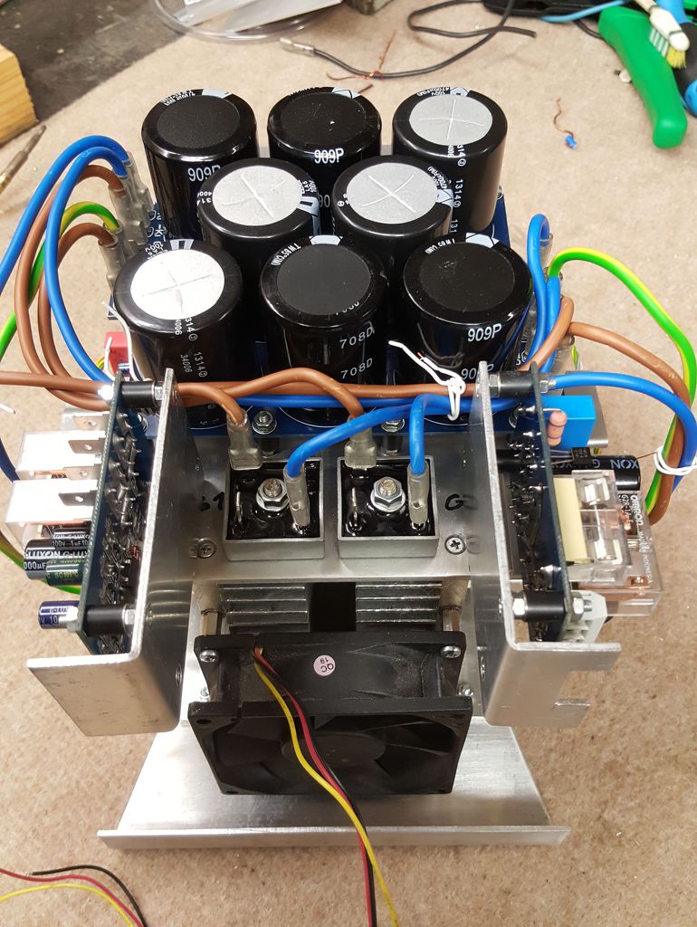Minkét oldal elsőre indult, semmilyen hibába nem ütköztem (a gondos kivitelezés jutalma). Ez azért is fontos információ, mert konkrétan ez a panel -amin van néhány apróbb módosítás az elsőhöz képest- még nem volt élesben tesztelve. Kipróbáltam műterheléssel, majd erre párhuzamosan bekötött hangszóróval is, amivel még egy 22R/5W-os ellenállást is sorba kötöttem, mert nem túl nagy a terhelhetősége. Kifogástalanul szól, persze ezt áramkorláttal még nem lehet igazán megítélni. Rövidrezárt bemenet mellett, a kimeneti DC-t is próbáltam megmérni. Az érték folyamatosan imbolyog, de mindkét oldalnál -0,7 és + 0,9 mV közti értékeket kaptam, amit kifogástalannak gondolok. A beépített kínai végtranyók egyenlőre remekül bírják az üresjárásban mérhető +-81,6 V-ot.