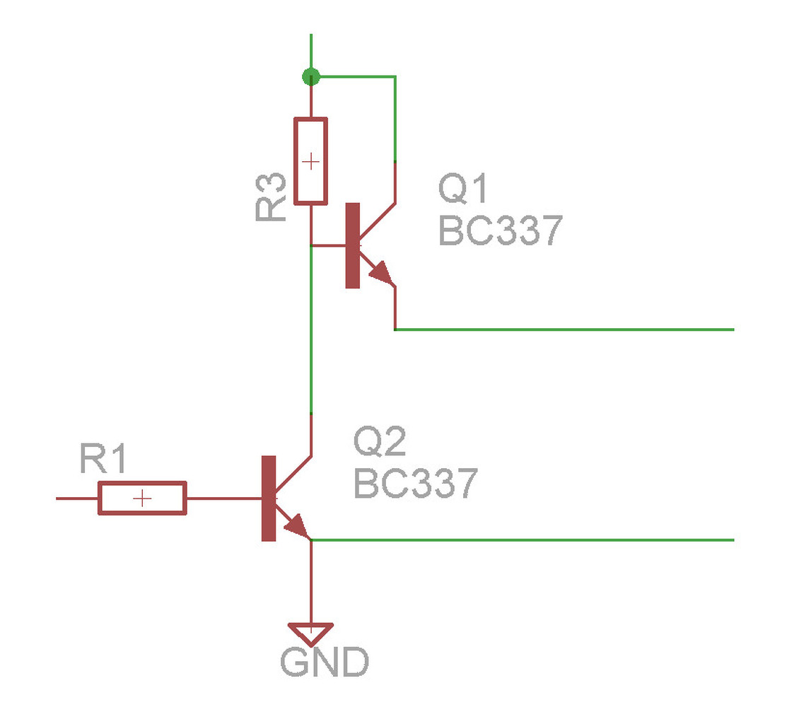 Szerintem inkább így csináld.( bár a diódát lehagytam, te ne hagyd ki.) Ha a DTR alacsony szintjére kapcsolna le talán kicsit jobb lenne , de szerintem így is működik. R3 akkora legyen hogy a fogyasztó jól működjön vezérlés nélkül, de ha nyit a Q2 annak a maximális áramát ne lépje túl a rajta folyó áram. Szerintem 500 ohm nagyjából jó lenne oda. A te kapcsolásod szerintem nem jó, hiszen az első tranzisztor bázisán max 8,5V lehet, az emitterén 8V , ez a PNP tranzisztor lezárásához nagyon kevés. ahhoz 24V kellene. ha meg a kimenet negatív, a tranzisztor mintha ott sem lenne, megint csak nem csinál semmit.