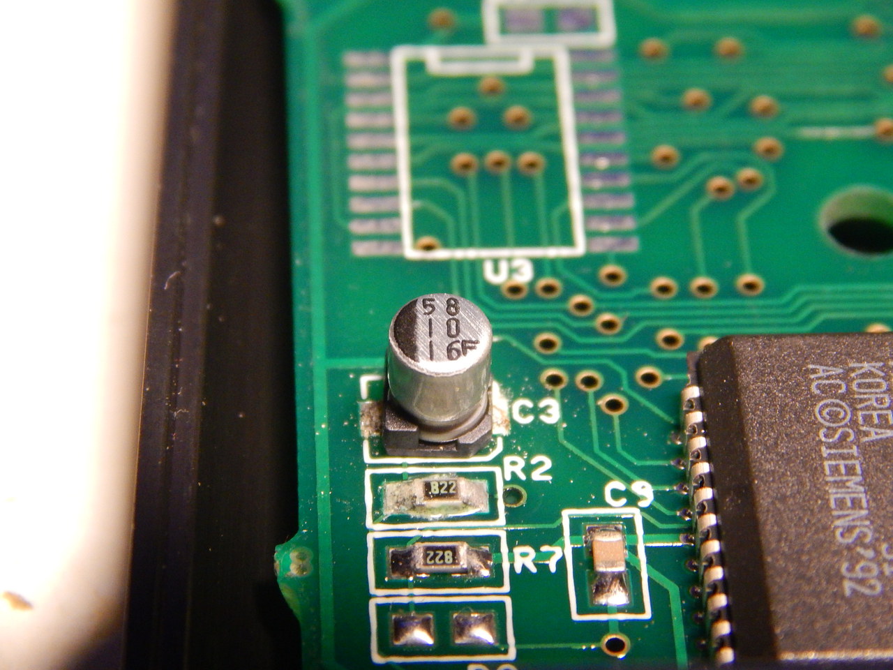 Az alábbi képeken látható 2db SMD kondinak mi a pontos értéke (a lábai oxidosak gondolom kifolytak) ? Tesztelés képen normál kondival is helyettesíthető a tesztelés idejére, és gondolom hogy az SMD kondin a fekete festés jelenti a negatív pólust ? Kondin ez olvasható: 58 10 16F