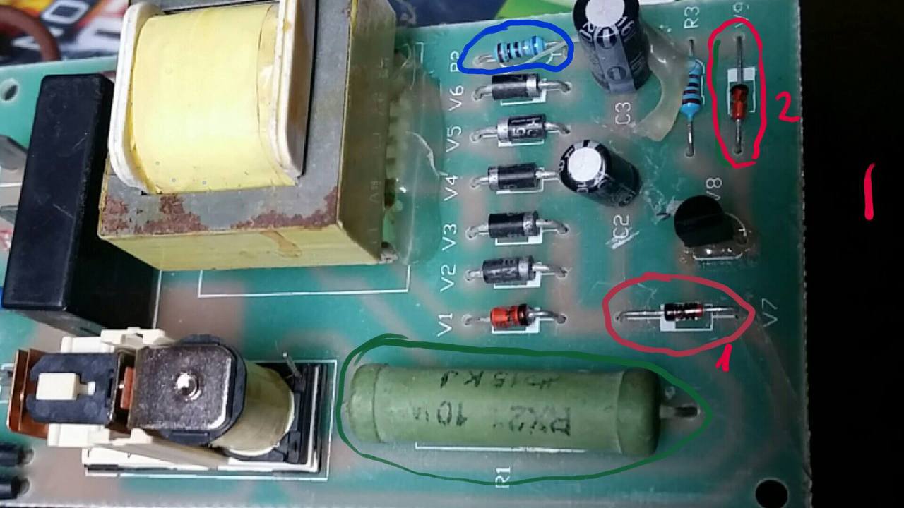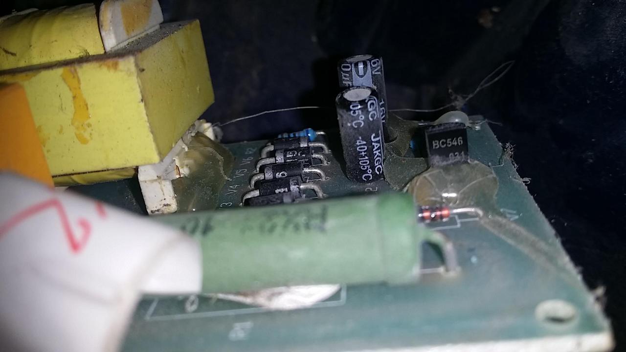 Az npn tranzisztort kimértem,A középső lábára raktam a pirosat és 500 és 600 körüli értéket mutatott mind a két szélső lábhoz képest a két szélső láb egymáshoz képest nem zárlatos.A diódákat kezdtem mérni az 1 es bekarikázott mind a két irányba mutat egyik irány 430 másik irány 1600.Bár ez egy kicsit másabb fajta vagy nem is dióda?A 2 esel bekarikázott az ugyan olyan mind az 1 es csak itt az egyik irányba mutat bár mikor megfordítom akkor egy pillanatra az is mutatja az 1600 körüli értéket de csak egy másodpercig.A kékkel bekarikázott ellenállás meg szikrázni kezd mikor gépet csatlakoztatok az aljzatba és elindítom.A nagy zöld meg eléggé melegszik .Röviden ennyi lenne
