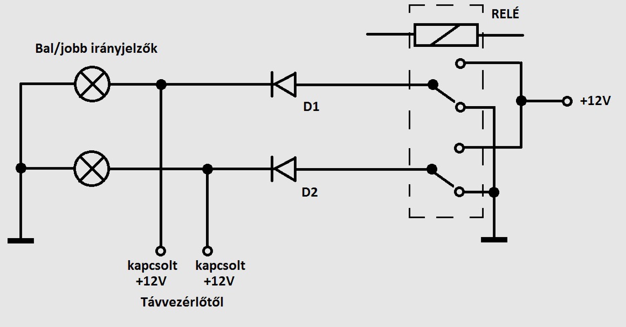 Az alábbi módon kellene bekötnöm két diódát. Melyik 1Nxxxx dióda alkalmas ide, ami elbírna ugyebár 12, de inkább 14V-t és olyan 10 A-t üzemszerűen? Így a kapcsolt 12V nem zavarná az autó (CAN-buszos) indexvezérlőjének reléjét, ami alapestben testre húzza az izzókat.