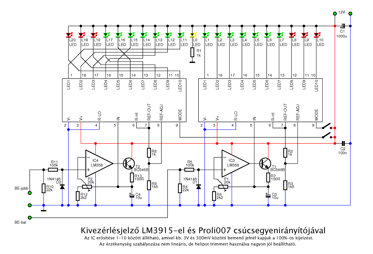 Hello! Az oldalon eléggé el van nagyolva a dolog. Többek között azt sem lehet tudni, mekkora tápfeszültségre készítették. Pedig a műveleti erősítők referencia feszültségét a tápfesz leosztása adja. Nincs benne egyenirányító és az sem tudható, Te milyen jelre kötnéd rá. Az 1kohm-ok alapvetően maradhatnának, de az osztó alján a 20kohm rengeteg. Így kb. 2dB lenen a kijelző átfogása, ami elég érdekes, mert egy szint felett szinte egyszerre jelezne az összes Led. stb. Tehát sok itt a kérdés. De valami korrektebb kapcsolást is kereshettél volna Pld.. De itt az oldalon is épített már valaki 40Led-es kijelzőt, csak meg kellene keresni..