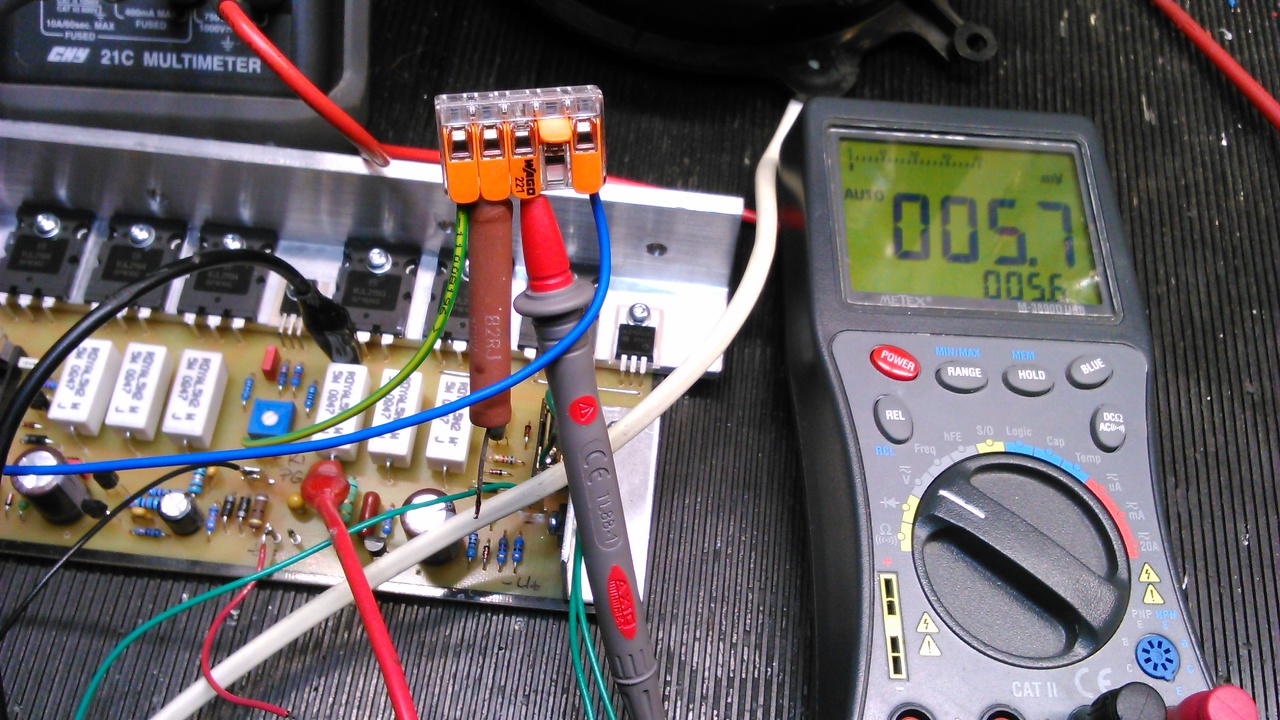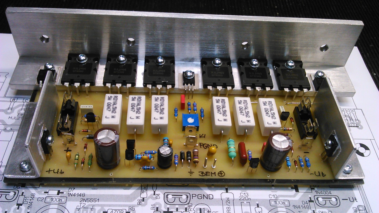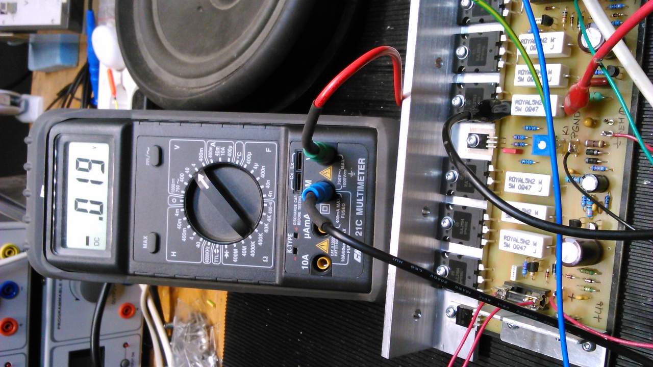 Ma volt egy kis időm és egyik végfokot élesztettem. Úgy néz ki nincs semmi gond vele, 60w izzó - 10 ohm ellenállás a bizti helyén. Az egyen fesz kimenet szerintem rendben, a nyugalmi áramot az emitter ellenálláson 5 mv, de mindegy, hogy melyiken mérem? Ha beállítottam egy negyed óra kikapcs után kicsit kevesebb. A hangszóró kézi érintés a bemeneten szépen brummog már amennyit a 10 ohm enged.