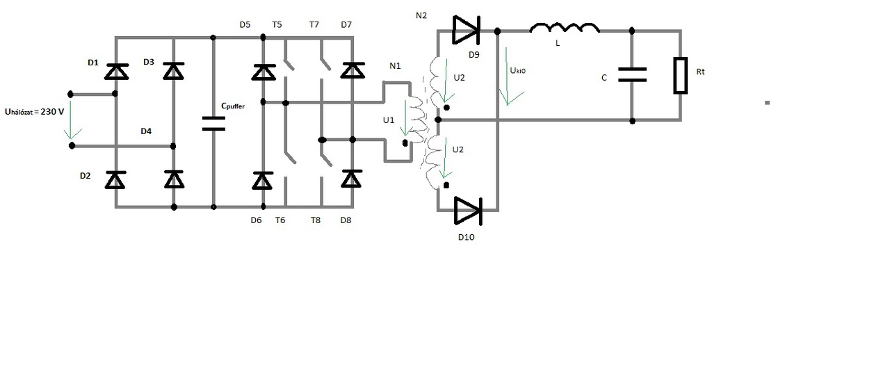 Szeretnék építeni egy kapcsolóüzemű tápegységet galvanizáláshoz, 960W-os teljesítménnyel. A kimeneten 24 V egyenfeszültség vehető le, és 40 amperre lehessen maximálisan terhelni. Na most, arra gondoltam, hogy Full-bridge konvertert lesz az alap. Mellékelek egy paint képet a kapcsolási rajzról. Az a problémám, hogy a Graetz-hídas egyenirányítás után meg kellene határoznom, a maximális-és a minimális egyenirányított feszültség középértéket, hogy el tudjam kezdeni a transzformátor méretezését. Uemax és Uemin. Uemax oké. Ügye gyök2*1,1*230. Ez olyan 355 V körüli érték. Uemin viszont nem megy. Ügye, ez úgy nézne ki (szerintem), hogy gyök2*230*0,90 - a diódák feszültégesése. Ez olyan 292 V körüli érték. Ez talán akkor lenne jó, ha nem terhelem a kapcsolást. Viszont terhelt állapotban, egy alfa szög után a pufferkondi T = R*C időállandóval exponenciálisan elkezd kisülni. Na, nekem az az érték kéne, amikor a pufferkondi feszültsége eléri a egyenirányított feszültség adott értékét, azaz Uemin-t. Egyszerűen nem tudok rájönni.