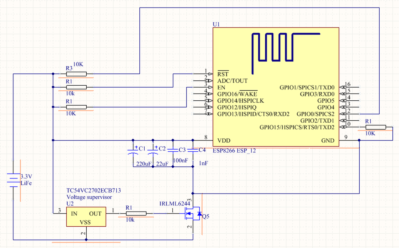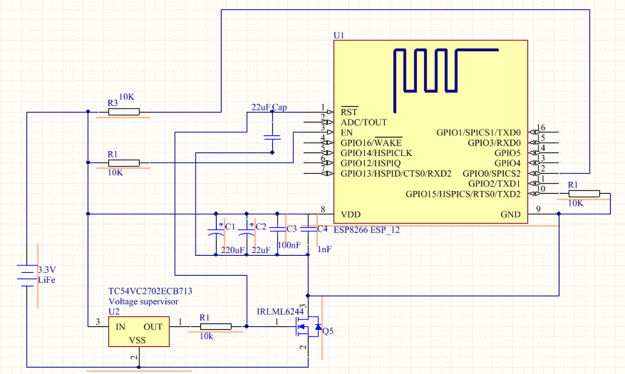 Egy ESP8266 modul üzemeltetését szeretném megoldani LiFe aksiról. Jelenleg az akkuvédő áramkörön dolgozom, aminek az lenne a feladata hogy túlmerülés esetén(~2.7V) egyszerűen egy FETen keresztül megszakítja a modul és minden fogyasztó áramellátását.