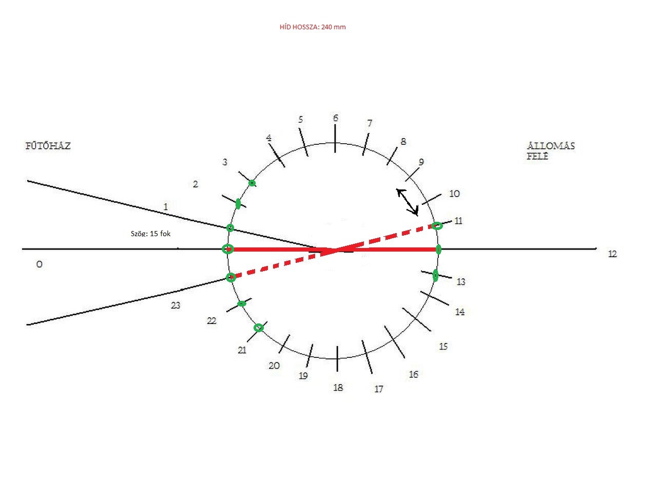 Amennyiben működik az áramtalanítva elfordítás fotózáshoz, úgy a betett skicc szerinti 10 zölddel jelölt helyen kellene csak megállni, s a nulla pozíció változatlanul a híd egyenes, tele piros állása lenne, ahogy összeköti a vágányokat a két szélen.