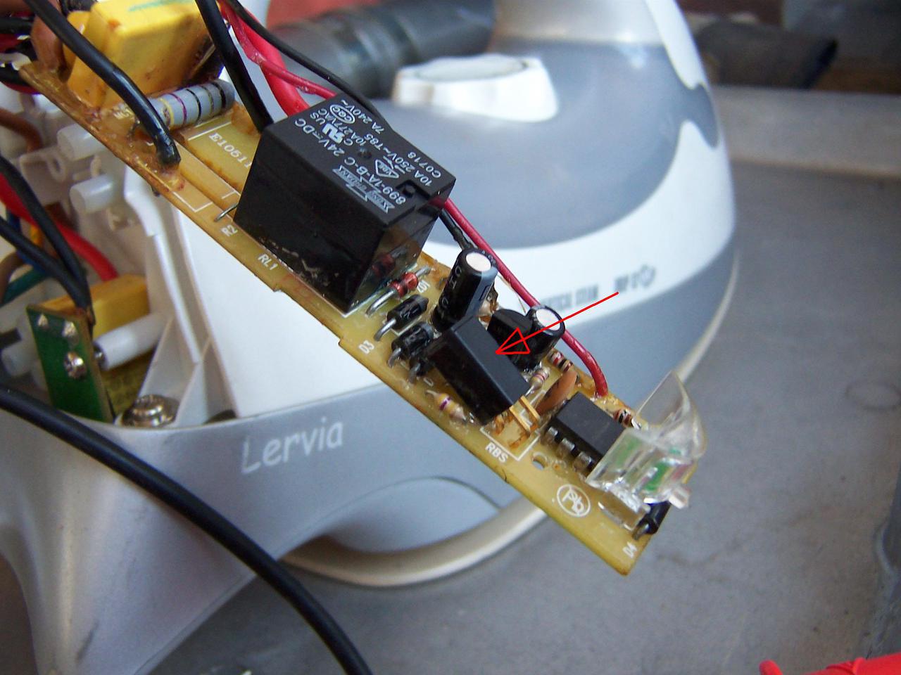 Egy gőzölős vasaló elektronikája van a képeken. Milyen alkatrész a nyíllal jelölt?