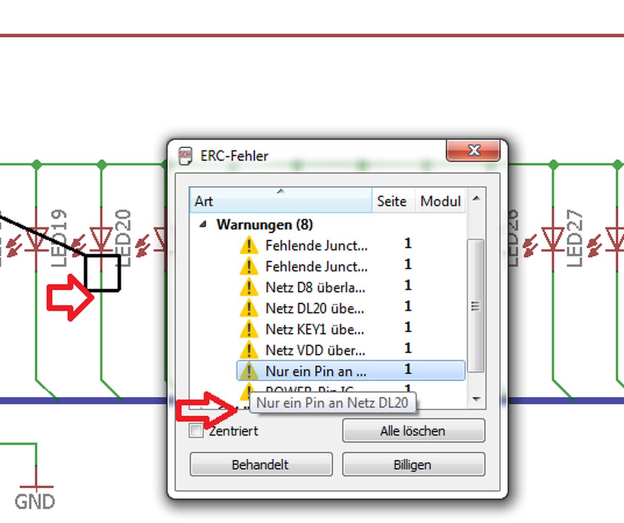 Van olyan amikor úgy látszik , hogy jó a kötés , és valamiért még sem jó az ellenőrzésnél.Ha megfogod a ledet a kapcsolási rajzban , és kicsit odébb húzod akkor a vonalak mennek vele együtt ? A másik pedig az , amikor túl rá van húzva a vonal vezetés , és hiába , hogy a led kapcsolódik viszont a túl érő vonalat az ERC úgy veszi mintha menne valahová , és így nem talál csatlakozást hozzá pedig csak egy vonalvégződés az , és ezért hibát ad ki rá.