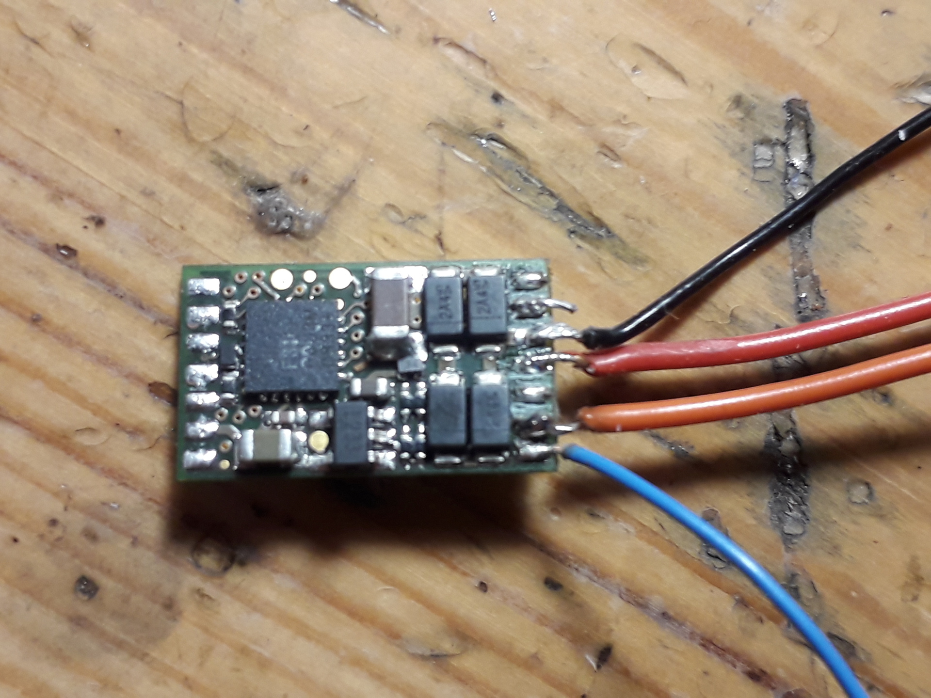 Neten megnéztem a képeket,de nem találtam hasonló,leginkább az ESU -hoz hasonlít Az a bajom vele,hogy kivettem a mozdonyból és azóta se az irányra sem a sebességre nem reagál ,narancssárga és kék között 20V van folyamatosan Az előző tulaj valamit jól belegányolt...