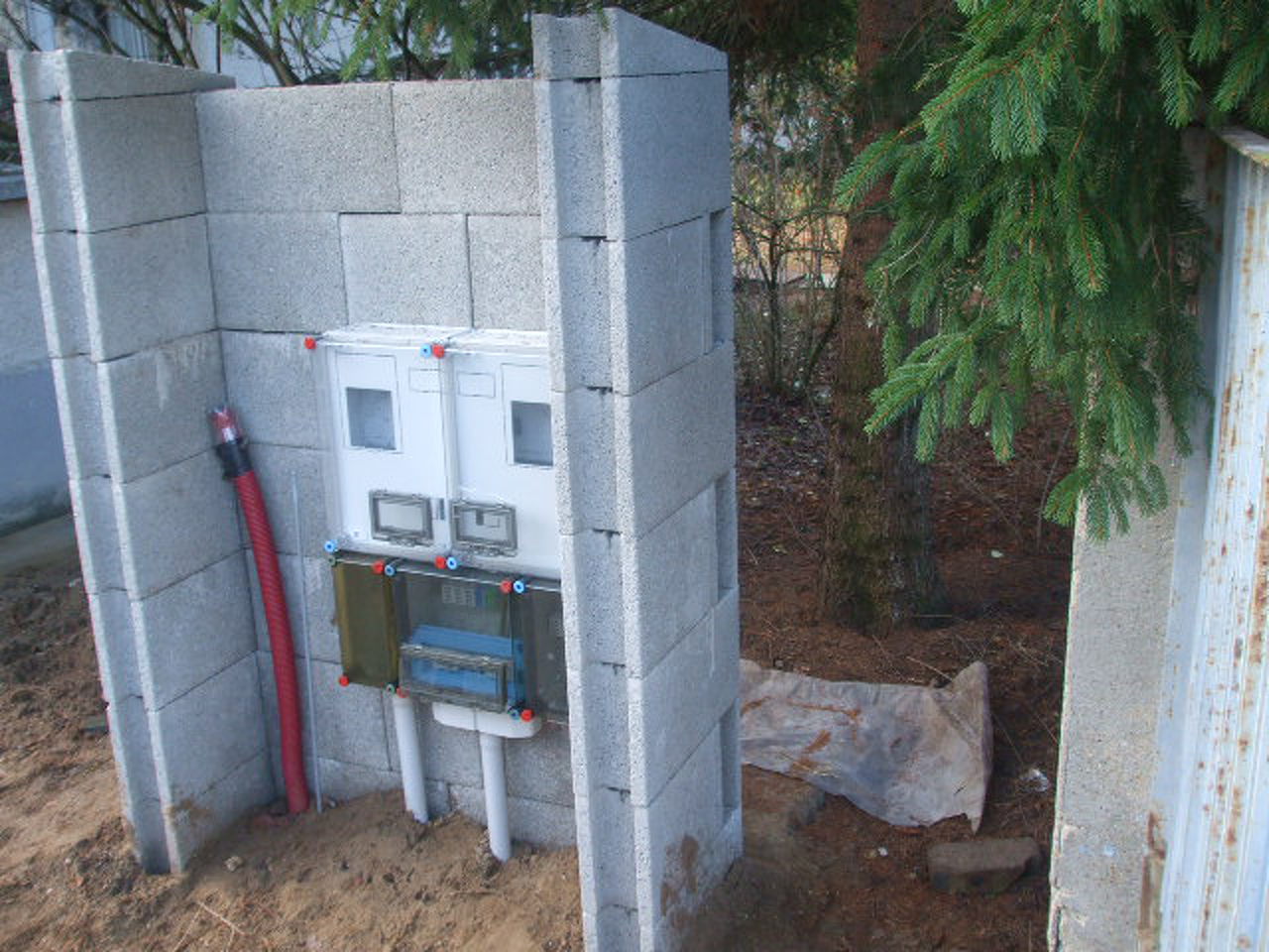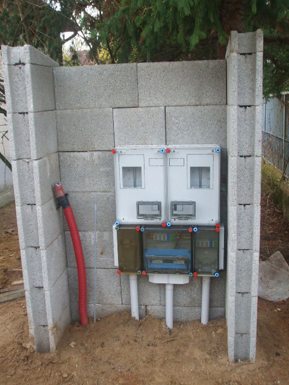 Igen az is lényeges különbség, hogy a mérőhely az épület külső homlokzatán, vagy jelen esetben, mivel 35 m-re van az épület az utcafronttól, így a bejárati kapu közelében lett elhelyezve. Az elosztószekrény pedig lakáson belül a bejárati ajtó közelében van .