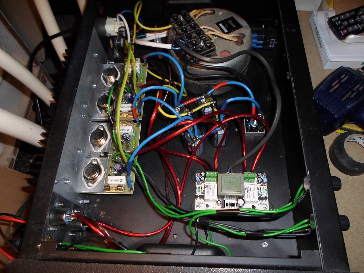 Sziasztok! Beépítettem a kis erősítőmbe a védelem modult ma,nagyon jól működik,és szerintem sikerült szakszerűen beépíteni a beag házba.Megmutattam ezeket a képeket a végfok modulok tervezőjének és nem kifogásolt rajta semmit.( facebook-on építők csoportban,-ahonnan már fontolgatom a kilépést-,valakitől megkaptam,hogy nincs csillagpontosan vezetékezve,biztos zajos az erősítő,és rosszul forrasztok ( a forrasztást már más is mondta),és a pufferek feleslegesen lettek 10000 uf-ek ,mert 4700 kellene,és nem kell négy puffer csak kettő,egyébként minden jó)....a csillagpont /amit én értek ezalatt/ ott van a moduloktól jobbra,ahol a gyári beag apt 100-nál is ,a jelen kívül minden föld vezeték oda megy,akkor most én tudom rosszul,vagy ő?Az utolsó fotót most sötétben készítettem de talán látszódik a lényeg.Akkor most tényleg nem jó így?