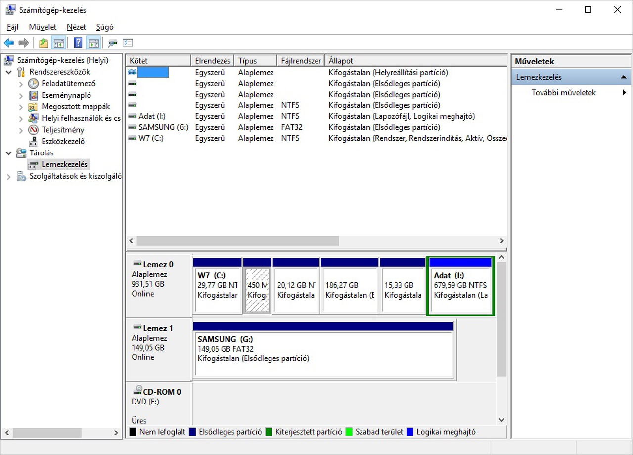 csak a rendszerben látom a HW között:Azaz itt valamennyi lemezt, belsöt meg külsöt látom, de az uj itt nem jelenik meg, igy nem is tudok innen továbblépni. Ha itt lenne, akkor nem lenne semmi gond.
