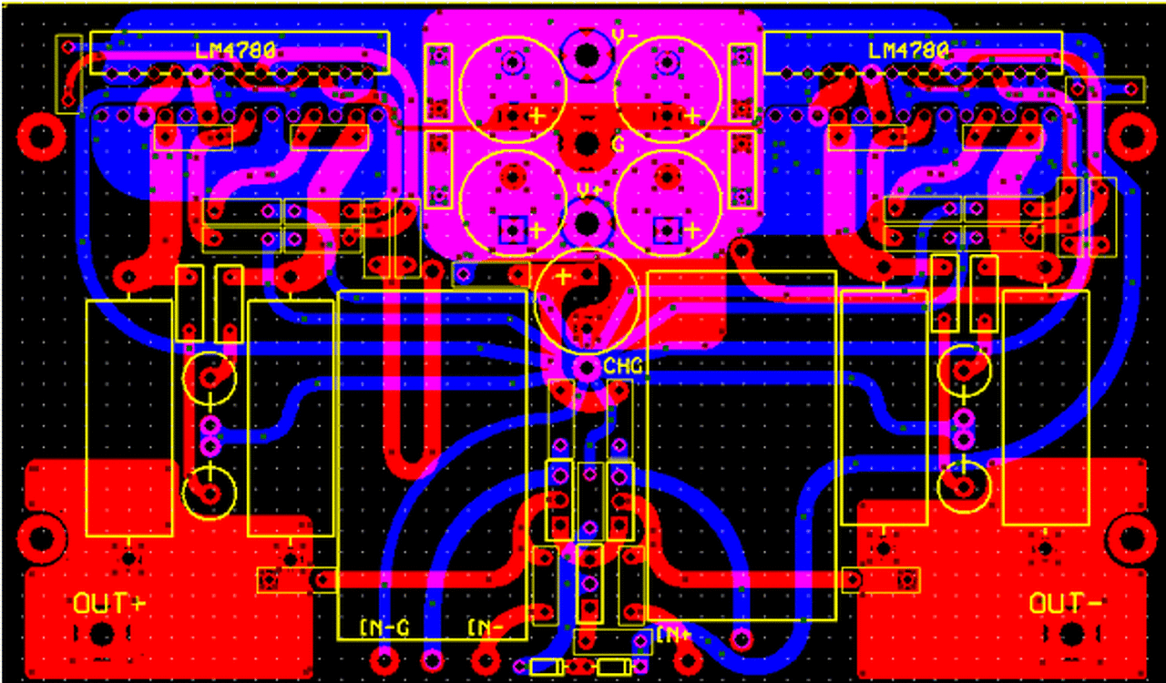 Még rosszabb, hogy diptrace-be behívtam és tüzetesen megnéztem ! Nem jól van strukturálva a gnd, most is ezt mondom. Egy kiinduló pontra van kötve az ingnd, a Zobel kör , a segéd elkok és a hangszóró gnd. (Ez egy visszacsatolás) Nagyobb kivezérlésnél ebből akár gond lehet. Alsó- felső rétegre kellene szeparálni a kis és nagy áramú gnd pontokat.