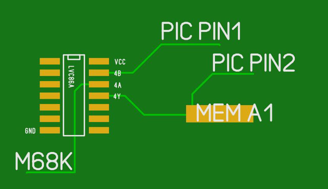 74LVC86 Y lába vagy is kimenete, csatlakozik közvetlen memória címbitre illetve egy PIC PIN is csatlakozik ugyan arra a címbitre, de ez a PIC PIN bemenetre van állítva, hogy ne befolyásolja a vezetéken lévő szintet.