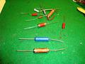 Folytatom a Standardot. Még mindíg az alkatrész gyártásnál tartok. Ma a kisebb kondik, meg az ellenállások voltak soron. A papir kondenzátorokat úgy szoktuk felújítani, hogy hajszárítóval megmelegítjük, kihúzzuk a belét, és új kondit teszünk bele, majd lezárjuk kátránnyal. De most ez itt nem megy, a papírok is annyira penészesek, hogy nem tudom visszarakni őket. Nincs mese, le kell gyártani a papírokat is. Ehhez 0.15-ös világosbarna kartont vettem, a feliratok számítógépen lettek kiszerkesztve, majd nyomtatás után a papírt csíkokra vágtam, és ragasztósan felgöngyölítettem. Szóval csináltam feliratos papír hengereket. Ebbe kerültek az új kondik a képek szerint. Ellenállásként a réz végű Remixeket használtam, ezek igen megbízható szerkezetek. Úgy lettek "antikolva" hogy a két végükről lecsiszoltam a festéket, és varnis csövet húztam rájuk. Ezt a megoldást régen is használták a rádiókban. Tekercset találtam készen, csak visszacsatolást kellett tekerni rájuk, meg talpat ragasztani a felfogáshoz.