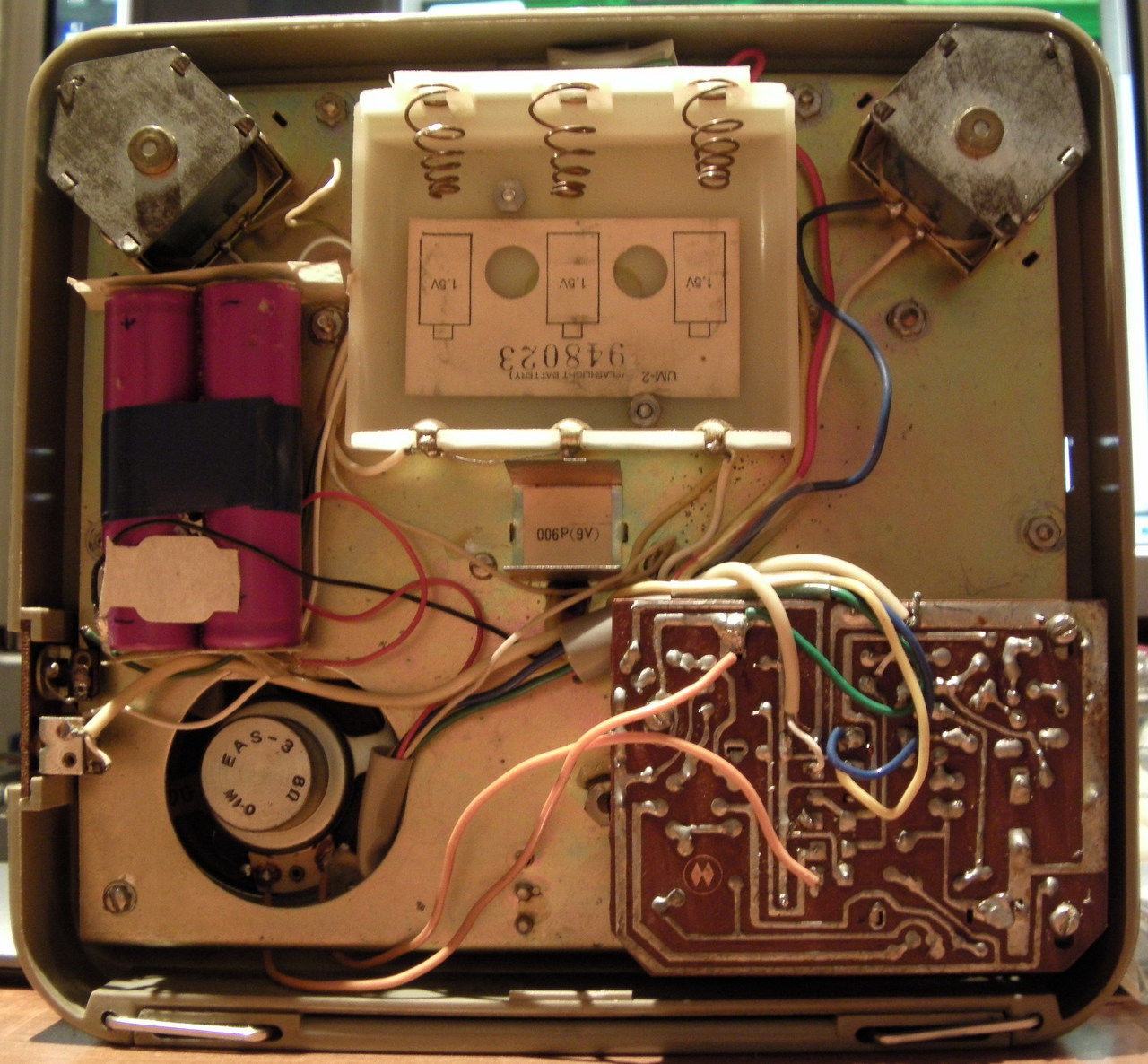 Két db. 1.5 Voltos párhuzamosan van kötve, ez hajtja a lejátszás motorját, a harmadikat sorba köti visszatekerésnél.