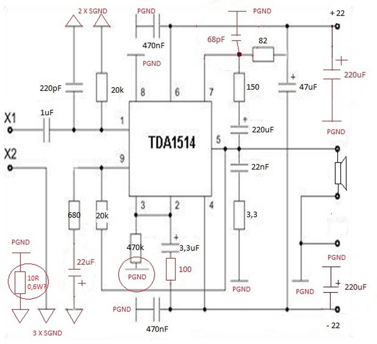 Újabb módosításokra van szükség a tda1514-el tervezett kapcsolással kapcsolatban, melyre Reloop kolléga hívta fel a figyelmemet. Csatolok egy újabb rajzot amelyen bejelöltem az általam kinevezett SGND és PGND pontokat.