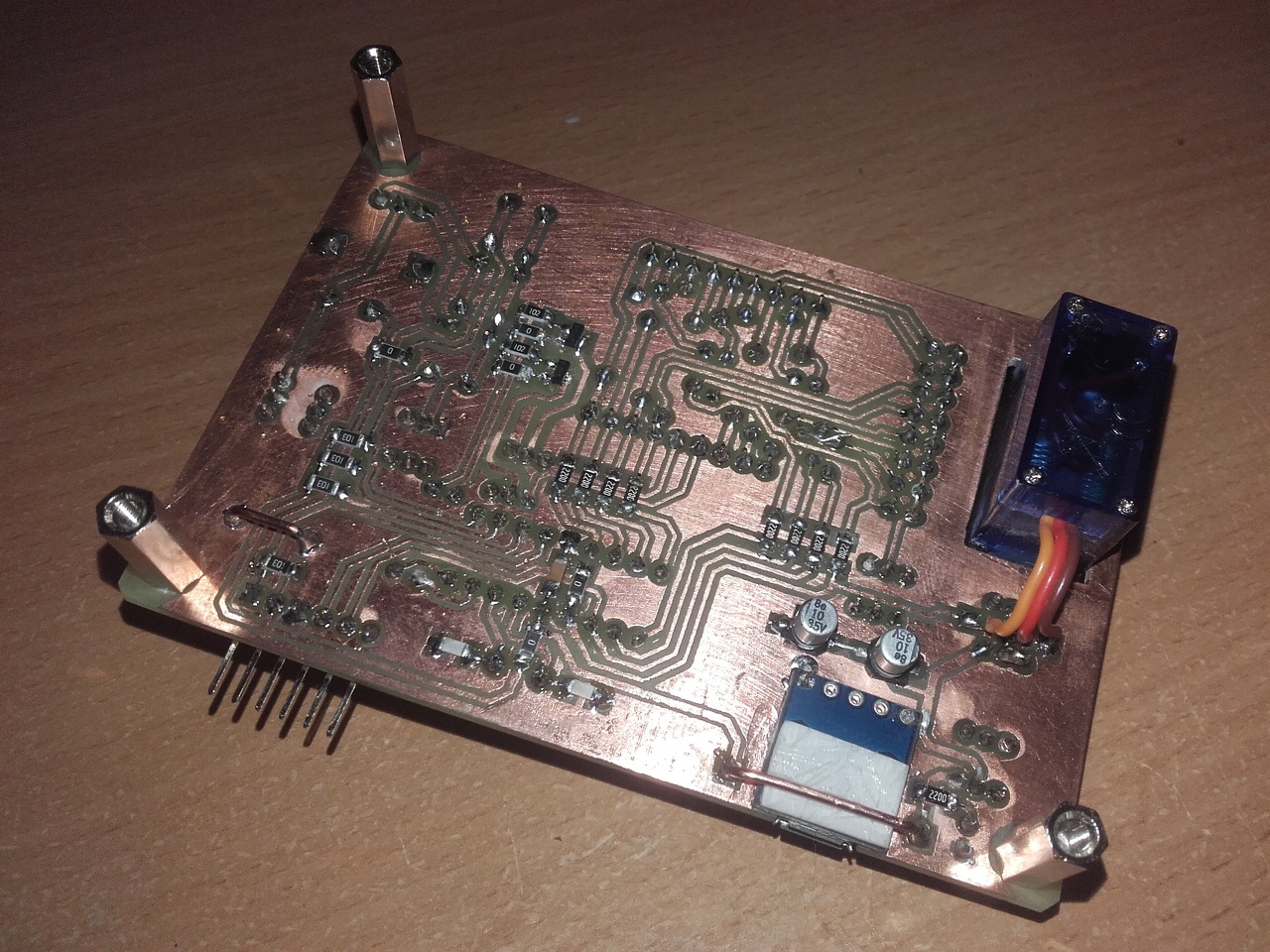 Két eszközt szeretnék bemutatni. Az egyik egy PIC16F628A-hoz készült fejlesztőpanel, amin helyet kapott egy forgó enkóder (nyomógombos), 3 nyomógomb, egy 2-digites 7-szegmenses LED-kijelző, egy LED-oszlop és egy mikro szervó motor. Az ICSP mellett egy mikro USB-s táplálásra is van lehetőség. Minden funkció külön-külön kapcsolható. A másik eszköz egy csillagászati távcsőhöz készült segédfény. 5db 10 mm-es piros víztiszta LED került bele. A táplálást egy 720 mAh-s LiPo akkumulátor biztosítja, ami mikro USB-vel tölthető. Funkciója, hogy ne rúgjak bele az állványba, lássam az osztást a tengelyeken, és könnyebb legyen okulárt cserélni. A piros szín miatt a megfigyelést sem zavarja, ha bekapcsolva marad.