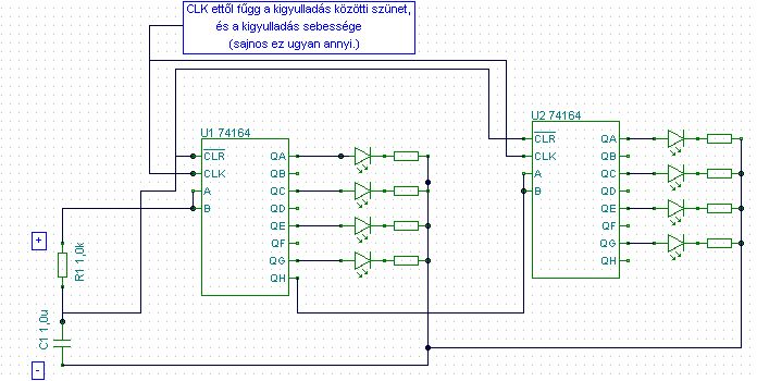 Ez egymás után sorban (kis szünetekkel ) gyújtja ki a ledeket nem tudom erre gondoltál-e.A ledek sorok száma tetszőleges (újabb icével +4,ha nem kell ennyi csak a szükséges kimenetig kell bekötni ) Az a lényege ,hogy minden órajelre arrébb lép a kimenő + (az előző helyen megmarad.)
