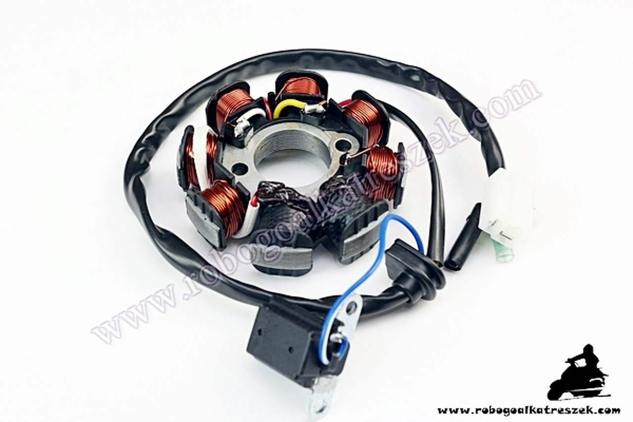 Polymobil 4T robogó. Amit elküldtem alaplap van benne. Kicseréltem a motoron az alaplapot a CDI-t a feszabályzót is a gyújtó trafót és még mindig nincs szikra. Se rúgásra se önindítózva se. Elég csúnya forrasztások vannak a motoron és kötözések. Az oldal sztenderd is kimértem az is jó. Arra gondoltam most már hogy kábel köteg csere.