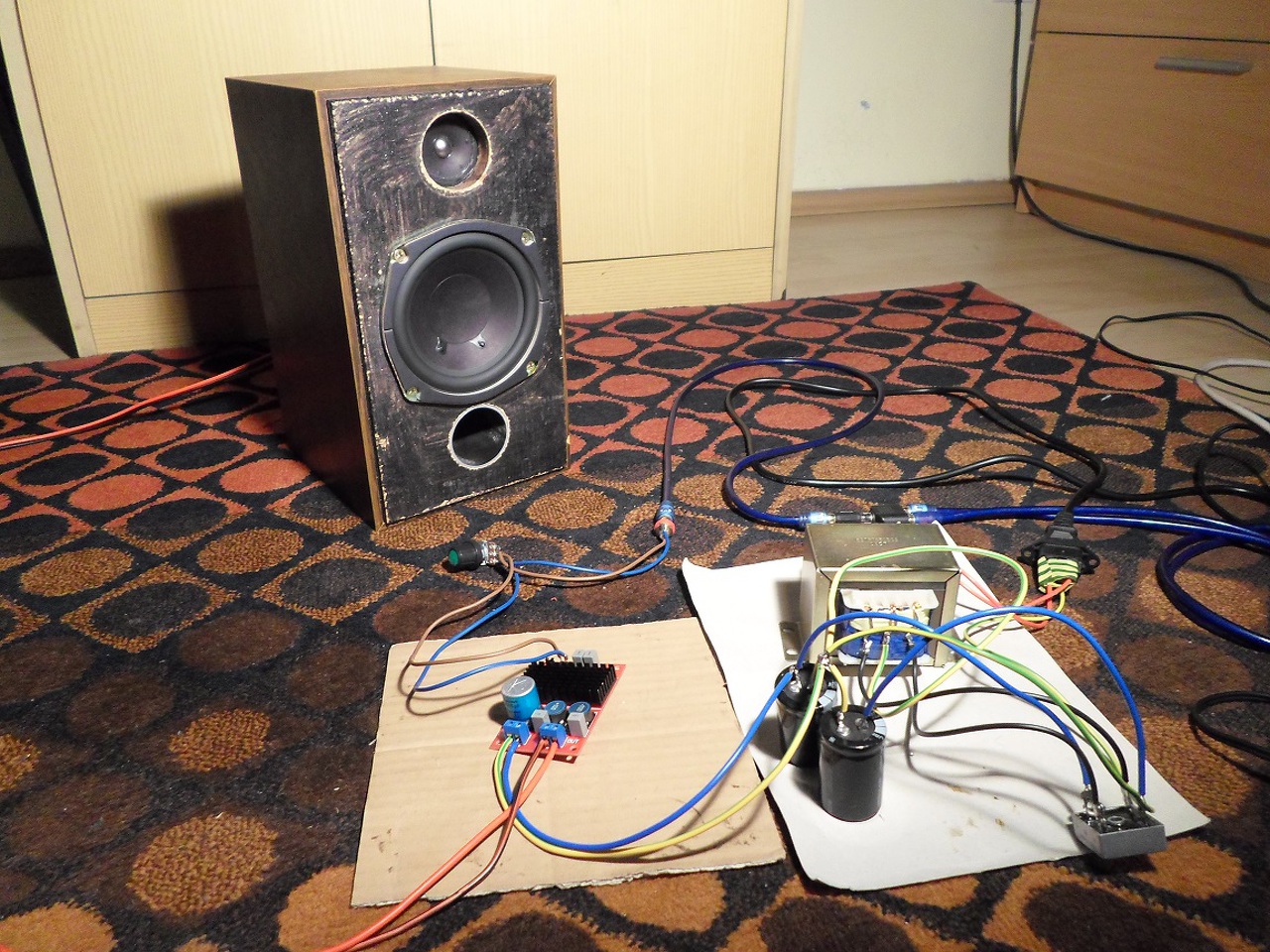 Sziasztok! A tranzisztor őrületem megtörni látszik,véletlenül kerültek hozzám ezek a dolgok,egyelőre csak a vázlat van meg,nincsen dobozolva a szett,de eszméletlen jól lehet vele szobában mozizni,zenét-rádiót hallgatni.Nagyon sok kísérletezés van ezek mögött,és a képen látható szett költsége tényleg minimális.TPA 3116 digitális erősítő panel (vatera 2600ft) 2x16v lemeztrafó (jófogás 3000 ft) , a kondik- egyebek itthon voltak, a hangsugárzó doboza ami adott volt , a hangszórók és a hangváltó (együtt kb. 2500ft) is egyedi,saját ötlet.Hangsúlyozom,beltérre ,szobába ( az enyém kb. 20 nm) tökéletes, 50watt RMS így az erősítő.És nem is szeretnék a hangszóró méretében sem feljebb menni,játszogatok a 16-20-25 cm-es változatokkal.Kültérre inkább 8"os kétutas hangsugárzókat hallgatok csakis tranzisztoros erősítővel.És érdekes,hogy anyagi okok miatt kezdtem el mono hangrendszert hallgatni,de nagyon hozzá lehet szokni,a jelet közösítem egy adapterrel,tehát azon kívül,hogy nem sztereo a hangzás,minden hang átkerül az egy darab hangsugárzóra.A trafó biztosan túl nagy,felesleges ekkora,de nem tudom honnan lehetne olyat szerezni ami optimális lenne,de az ugye alapszabály a tápnál,,hogy inkább több mint kevesebb.a Kondik 10000 uf 63 voltosak.