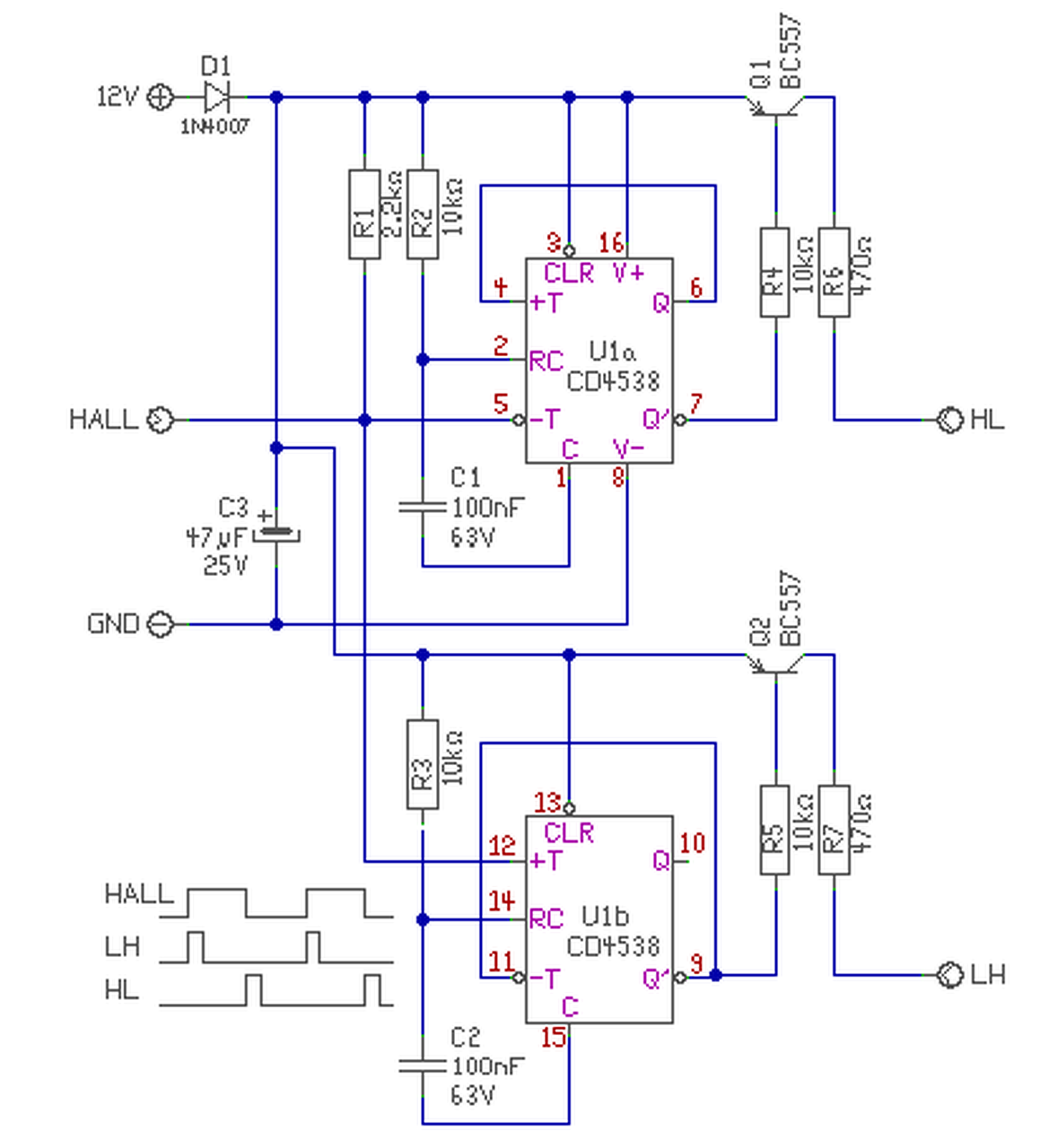 Köszönöm a rajzot!Megépítem próbanyákon aztán kipróbálom.Van itthon hozzá minden (igazából nagyon sok alkatrészem van). Egyetlen aggályom,hogy hogyan fogja viselni egy kis traktorban a zord körülményeket.A széles feszültség tartományra gondolok,önindítózástól (akár 9V is lehet),az üzemszerű állapotig (ami 14,4V max.) és még ehhez jönnek a vezetékhálózaton esetlegesen kialakuló feszültség tüskék.Két kimenetre van szükségem,két különálló gyújtóegységem van,ezek tirisztorait kell kapcsolgatni.Esetleg lehetne megoldás az,ha a hall generátort és a CD4538 IC-t egy 5V stabilizátorról táplálnám a BC557 tranzisztorok emittere maradna a 12V tápon,kellene valamit változtatni az áramkörön?