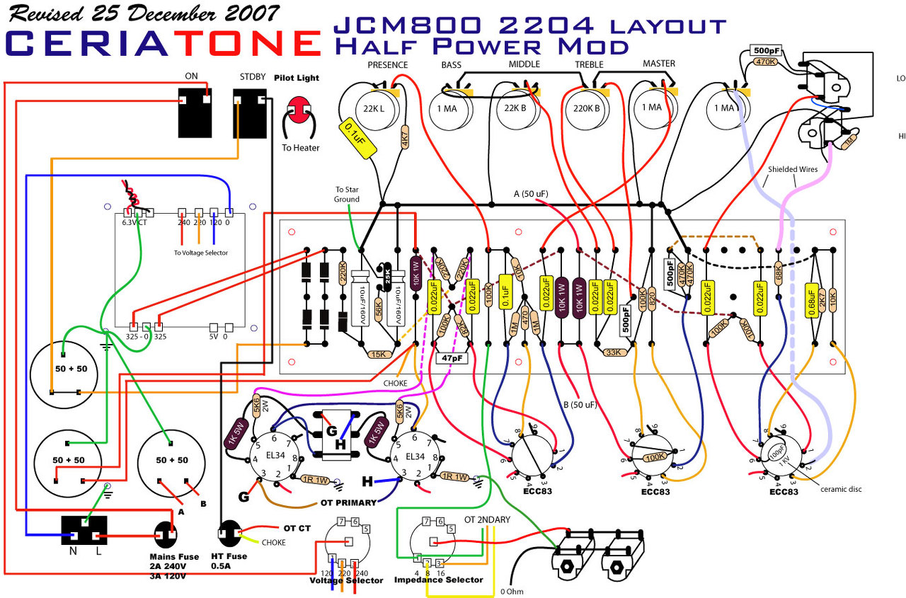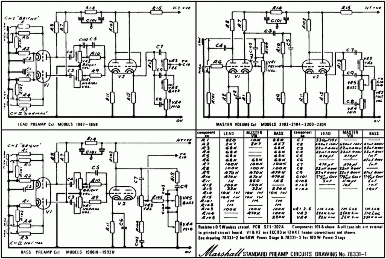 Cavalier: Az erősítő egy JCM 800 utánérzés, mellékelem a kapcs. rajzot, ami alapján készült. Hogy ehhez mérten a készítő, aki egyébiránt már nagyon nehezen elérhető (félreértés ne essék, nem rosszra célzok személyét illetően), mennyire és miben tért el, nem tudom megmondani. Egy biztos: trióda-pentóda kapcsoló került bele. Az elmondottak alapján tán nem lenne érdemtelen megpróbálkozni előfokcső-cserével sem. Ha jól tudom, a 6N2P bekötése más, mint a sima 12AX7 csöveké, de attól gondolom még relatíve egyszerűen kivitelezhető.... ? ![]() Ami az anód- és rácsellenállásokat illeti, meg lehetne éllapítani valamiből, milyen típus került bele?