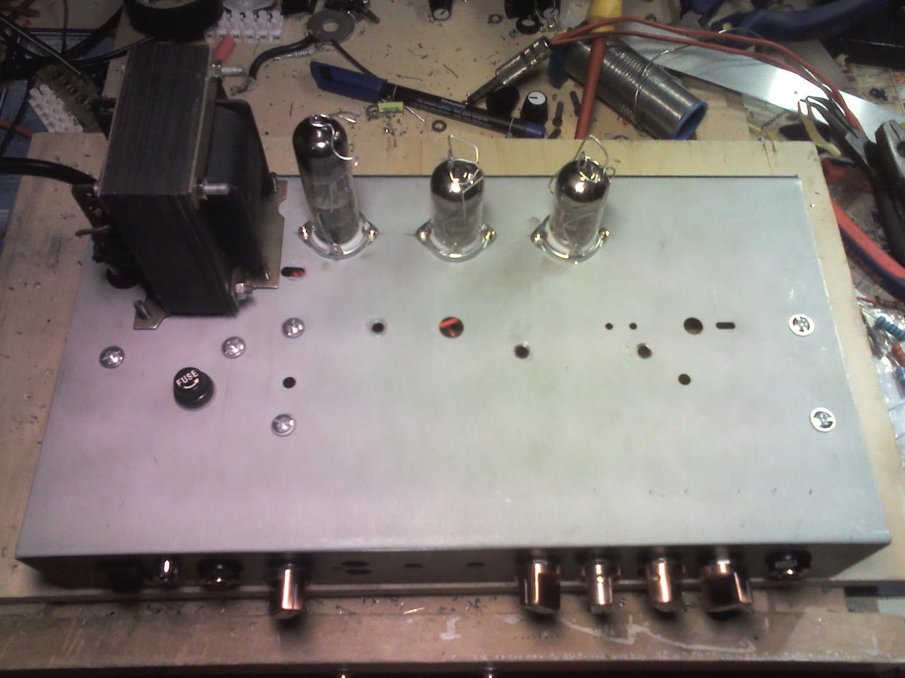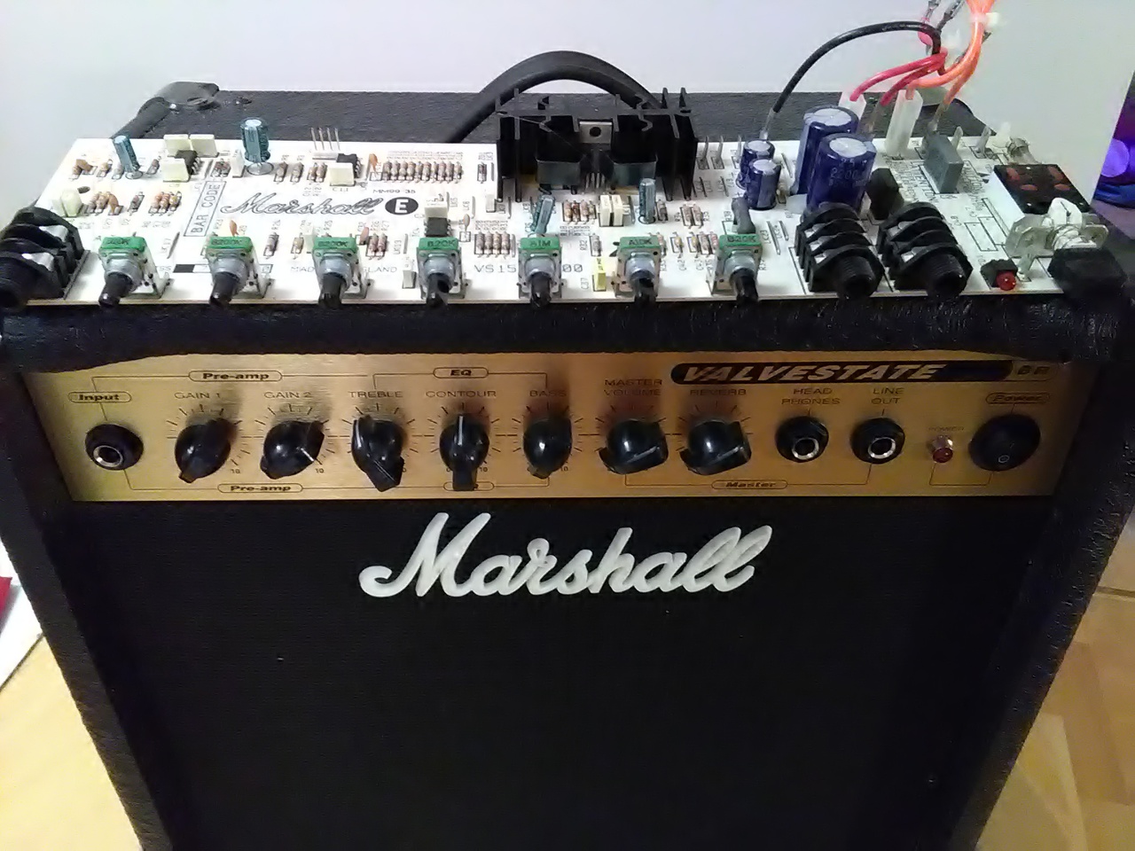 Nemrég készült el egy újabb csöves kombóm. Marshall valvestate 15 volt az alap. Most JMP plexi van benne aminek EL 84 a vège. Videoton Szimfónia de lux a hálózati trafó. A kimenő pacsirtáé. Negatìv visszacsatolás nélkül egèsz hangos. A zengetőt is bekötöttem, de a meghajtásáról egy TL074 gondoskodik. Kicsit tájidegen a csöves környezetben. |