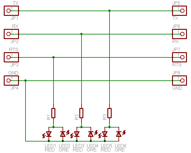 Az egyik oldal a bemenet, a másik a továbbmenő kimenet. A LED-eken látszik az adott vonal állapota: ha zöld, akkor RS232 magas szint (negatív feszültség), ha piros, akkor RS232 alacsony szint (pozitív feszültség). A LED-eket úgy kell megválasztani, hogy 1mA áramnál már jó fényük legyen (kifejezetten kis áramú típusok), az ellenállások kb 6.8kohm-ok legyenek. Létezik kétszínű LED is egy tokban, bár lehet, hogy kis áramú típust nehéz találni. (1-2 mA-nél nagyobb árammal terhelve már a továbbmenő ágon lévő áramkörnek lehet gondja, ha a jelszint a szabványos RS232 szintek alá csökken.) Ha az egyik LED-et el akarod hagyni, mert csak egy állapotot szeretnél visszajelezni, akkor az elhagyott LED helyére köss be diódát, pl. 1N4148-at, mert a LED nem szereti a pár V-nál nagyobb fordított polaritású feszültséget.