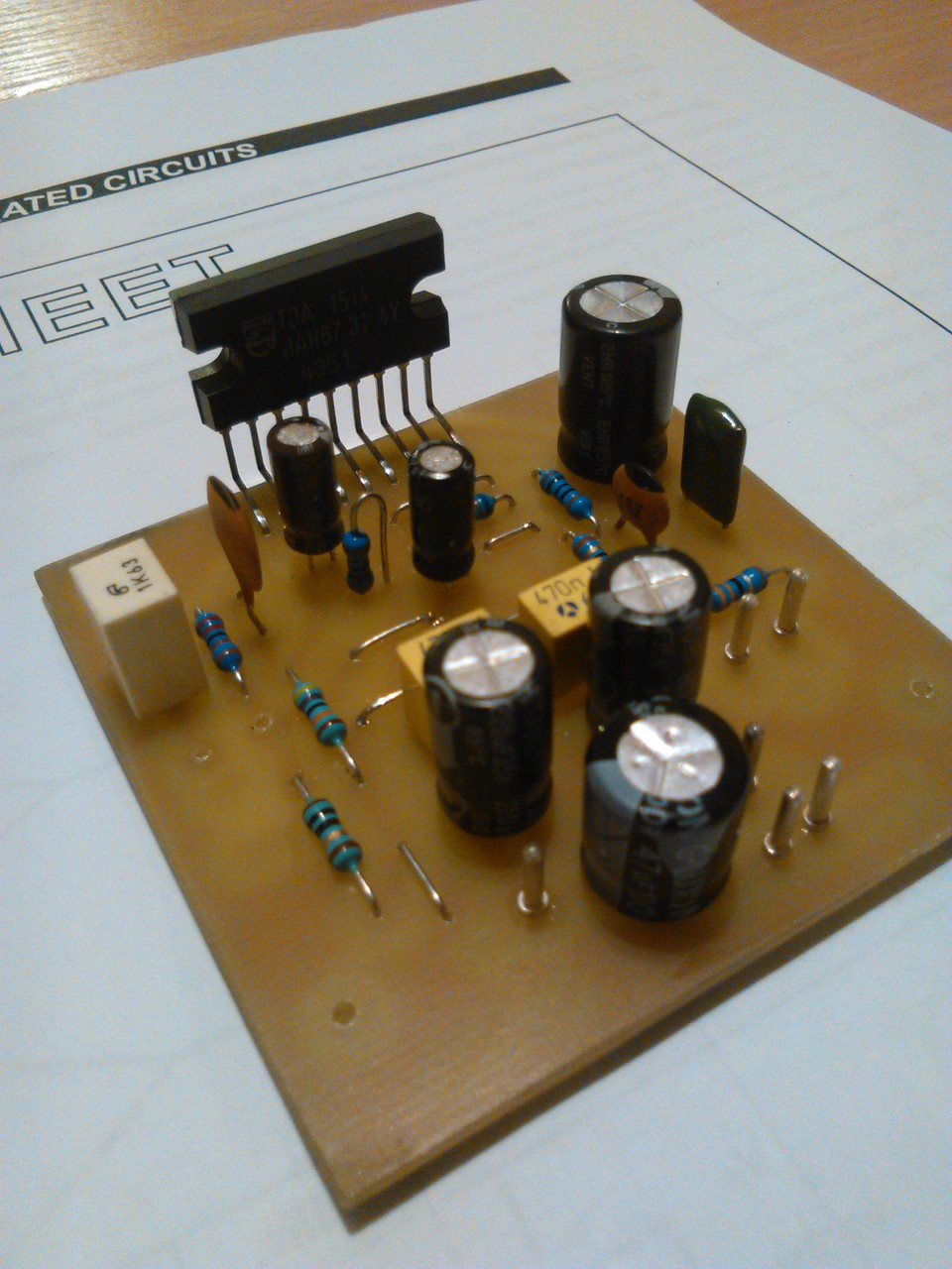 Nem tértünk ki rá külön, ezért felhívom két szabályra a figyelmedet. Az IC-t hűtőbordára szerelve forrasztjuk. Mikor az erősítőt a tápra kötjük, a pufferek legyenek kisütött állapotban.