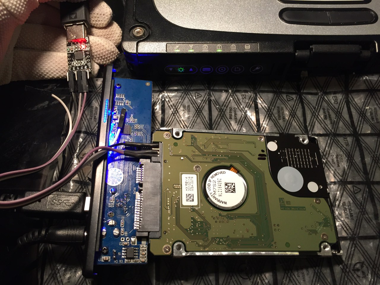 Van egy Samsung HM500JI HDD ami kapott egy pofont mikor egy zárlatos USB eszközt csatlakoztattam a laptophoz. Gép egyből kikapcsolt, scandisk hibák sorozatát találta. Partíciók eltűntek, azok közül a pqmagic undelete az XP-t (FAT32) látta de azon nem voltak fontos adatok. A nagyobb WIN7 (NTFS) partíció ami fontos egyáltalán nem látszik. HDD sentinel kifagy, HDD regenerátor se tud mit kezdeni vele, pqmagic is csak sokadjára indul el. S.M.A.R.T. értékeknél a raw read error rate magas, 90000 felett és folyamatosan emelkedik. Szerintem elektronika vagy fej hibáról lehet szó. Formázást felajánlja, de forrmázni nem mertem, hátha menthető. Közben beszereztem egy ugyanilyen HDD-t, firmware, PCB, LBA,stb. minden egyezik, 100%-os kondíció. Felcseréltem az elektronikát, rendben felpörög,de egyik HDD-t se látja a gép. Gondolom azért, mert a pályaadatokat (FdtTable?) a ROM tárolja, de itt nincs rom amit csak úgy átrakok, ezeket a Marvell 88i8823-TFJ2 flashben tárolja. Soros terminálon rácsatlakoztam normál és felcserélt elektronikával, nekem ott az jön le, hogy a PCB1 hibás, mivel a jó HDD-nél a rossz PCB-vel is hasonló hosszú adatsor jön. PCB1, HDD1 = hibás HDD, PCB2, HDD2 = jó HDD Szóval szerintem 2 lehetőség van : - a Marvellt átcserélni, (amit próbáltam, nem adja könnyen magát, viszont jól bírja a meleget), - terminálon keresztül kiadni a megfelelő parancsokat, vagy áttölteni a dumpot, hogy a csere PCB-vel elinduljon. - harmadik fél nem játszik. Ezen az oldalon egy csóka valami hasonlót csinált, viszont nekem az nem derül ki (csekély angol tudásom miatt), hogy pontosan mit is csinált és ezt csere PCB-vel csinálta-e. Van valakinek bármi ötlete, tapasztalata ezzel kapcsolatban? HDD adatok: Samsung HM500JI Rev. A FW : 2AC101C4 M7S2 W7S2_S1PME REV.04 R00 BF41-00249B 02 MCU: Marvell 88i8823-TFJ2