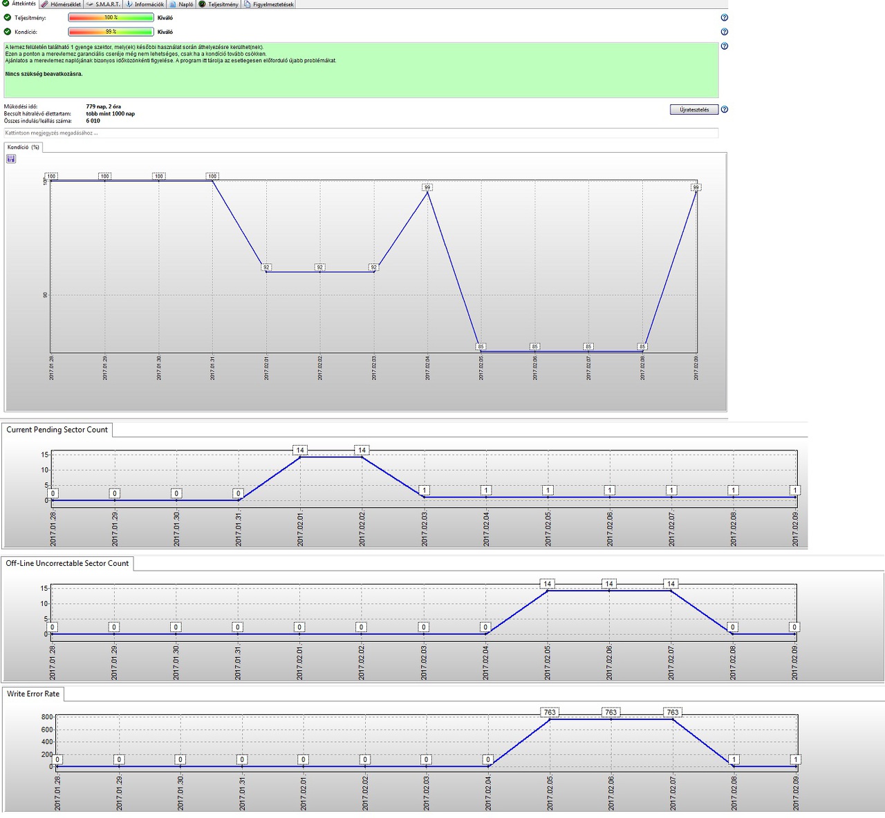 Van a gépembe egy WDC WD6400AADS típusú hdd, és az utóbbi időbe erre lettem figyelmes, hogy ilyeneket csinál. Régebben is voltak ilyen "hibái", csak azóta volt egy win újrahúzás, és azért nincs a grafikonon. Adattárolásra szolgál jelenleg (semmi fontos nincs rajta). Kb 2 hónapja mikor először láttam ezeket, kapott egy teljes formázást és egy teljes ellenőrzést, ott hiba nélkül ment. és utána minden értéke vissza állt 0 vagy 100%ra mint a képen látható az elején. Mi okozhat ilyen hibát, vagy anomáliát?