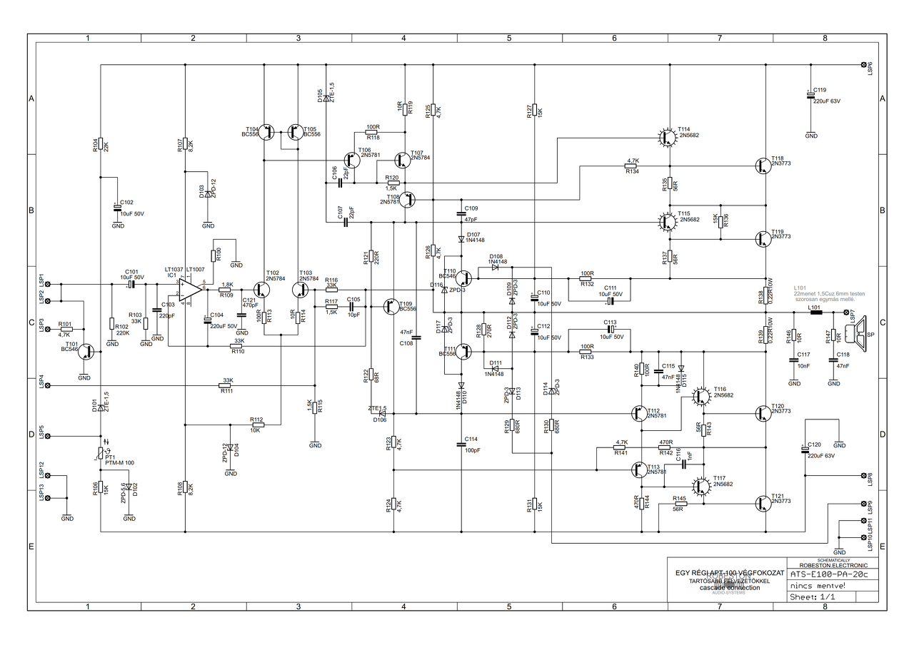 Szia! Furdalja az oldalam a szakmai kíváncsiság, hogy T104 kollektor és D105 anód galvanikus kapcsolatban áll-e az eredeti NYÁK-on. Nekem így lenne logikus, mert a nagyjelű erősítő áramkorlátozójának nézem, ami illő is ennél a kimeneti áramkorlátozó megoldásnál.