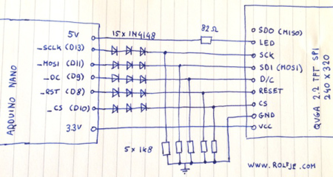 Gondolom CS láb is van. Logikai szintillesztő: HEStore. Vagy, a kimeneteket leosztod egy ellenállás párossal, a bemenet (MISO), ha minden igaz, megelégszik a 3,3 V-tal, mint magas szint. De valószínűbb inkább az, hogy a MOSI csatorna használva sincs, kijelzőből ritkán olvasunk vissza adatot.