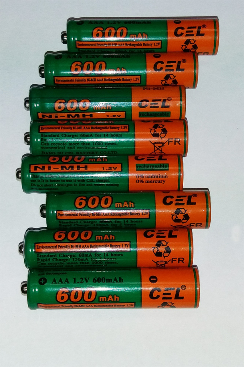 8 db. AAA méretű, Ni-MH, 600 mAh-s akku. Egy vagy kettő valószínűleg vesztett kb. 200 mAh kapacitást (egyszer nullára lett merítve), a többi elvileg jó állapotban van.