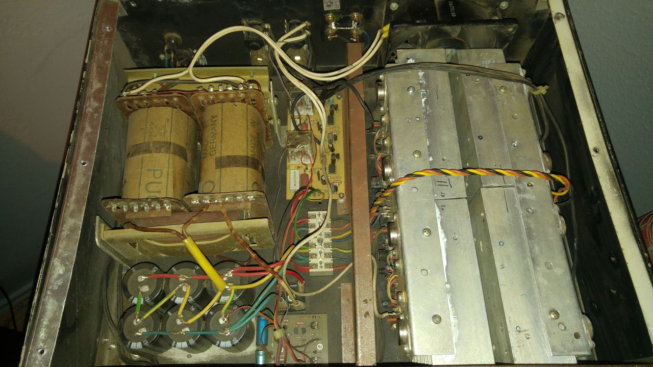 A panel 2 oldala közel tükör szimmetrikus egymáshoz képest, tehát 2db végfok van a panelon. Hogy a harmadik OPA minek van ott azt a kép alapján meg nem mondom, vagy valóban fázist fordít hogy hidalható legyen a 2 végfok, vagy valami kiegészítő funkciója van. Nem lenne rossz kivitel ha a tervező a TO3-as tokok helyett TO247-est használt volna, és akkor nem kellene egy tranyót sem kivezetékezni, meg az egész a tranyók csavarjaival felfogatható lett volna a bordára.
