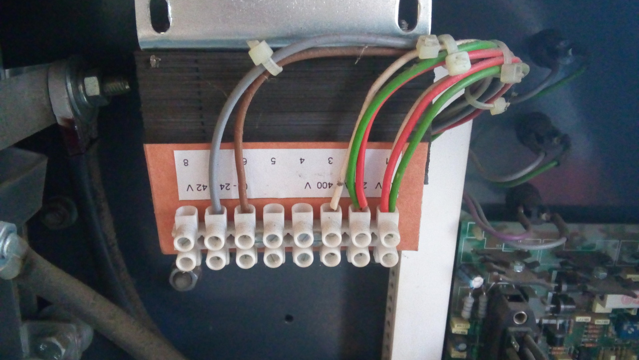 3 fázisú a gép így nincs nulla csak a 3 fázis, így csak 400V-ra lehet kötni a segédtrafót. Kapcsolási rajzot biztosra veheted, hogy nem találsz, de ha a vezérlés a probléma akkor a W122-es kapcsolási rajz jó lesz, mert arról lett másolva a Wel panel (amihez szintén nincs rajz).
