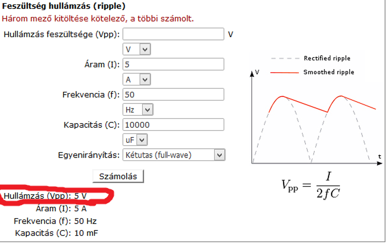 Az ábra elég jól szemlélteti, a hullámzás a csúcsból vonódik le. A diódán eső feszültséget se hanyagold el!