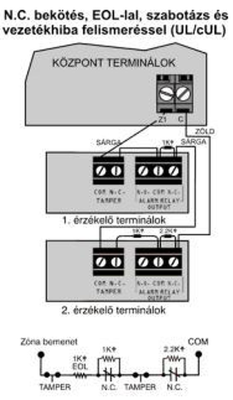 A kezelőhöz 1k kell, ha a zónabemenetét használod. Duplázhatsz zónát (én nem szeretem használni), ekkor be kell kapcsolni az ATZ-t és javasolt soros kötést használni. A kép, amit csatoltál soros DEOL. Annyival egészíteném ki, hogy az egy kilós tamper ellenállást két-két darab 1 kilós párhuzamos ellenállásból alakítanám ki. Így meglesz a tamper soros 1 kilója. A doboz tampernek van helye általában a fém központdobozokban, ahol át kell dugni (a talpa a doboz hátulja és a fal közé esik). Így jelzi ha leszakítják a központot és persze a nyitást is. Azt 1 soros ellenállással szoktam kötni, mert nyitott tamper zóna nem üzemszerű, karbantartáskor pedig egyszerűen kiiktatható. Ha a Z1 és a COM közé kötsz, akkor a kilóval zárt érzékelőd lesz az egyes, a 2,2 kilóval zárt pedig a kilences zóna.